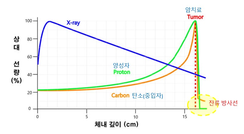 브래그 피크(Bragg Peak) – 양성자 빔이 암 조직에 도달하는 순간 막대한 양의 방사선 에너지를 쏟아부어 암세포를 죽이고 급격히 사라지는 현상