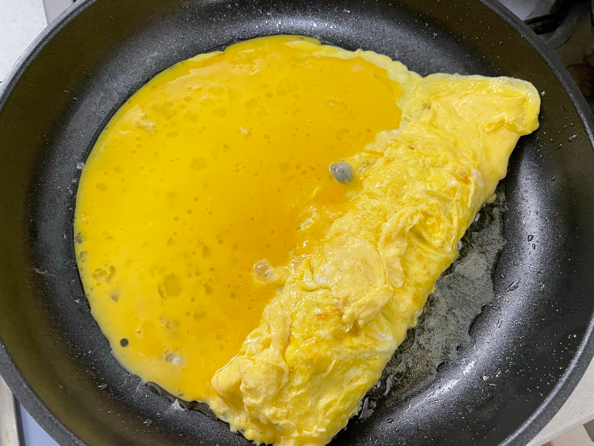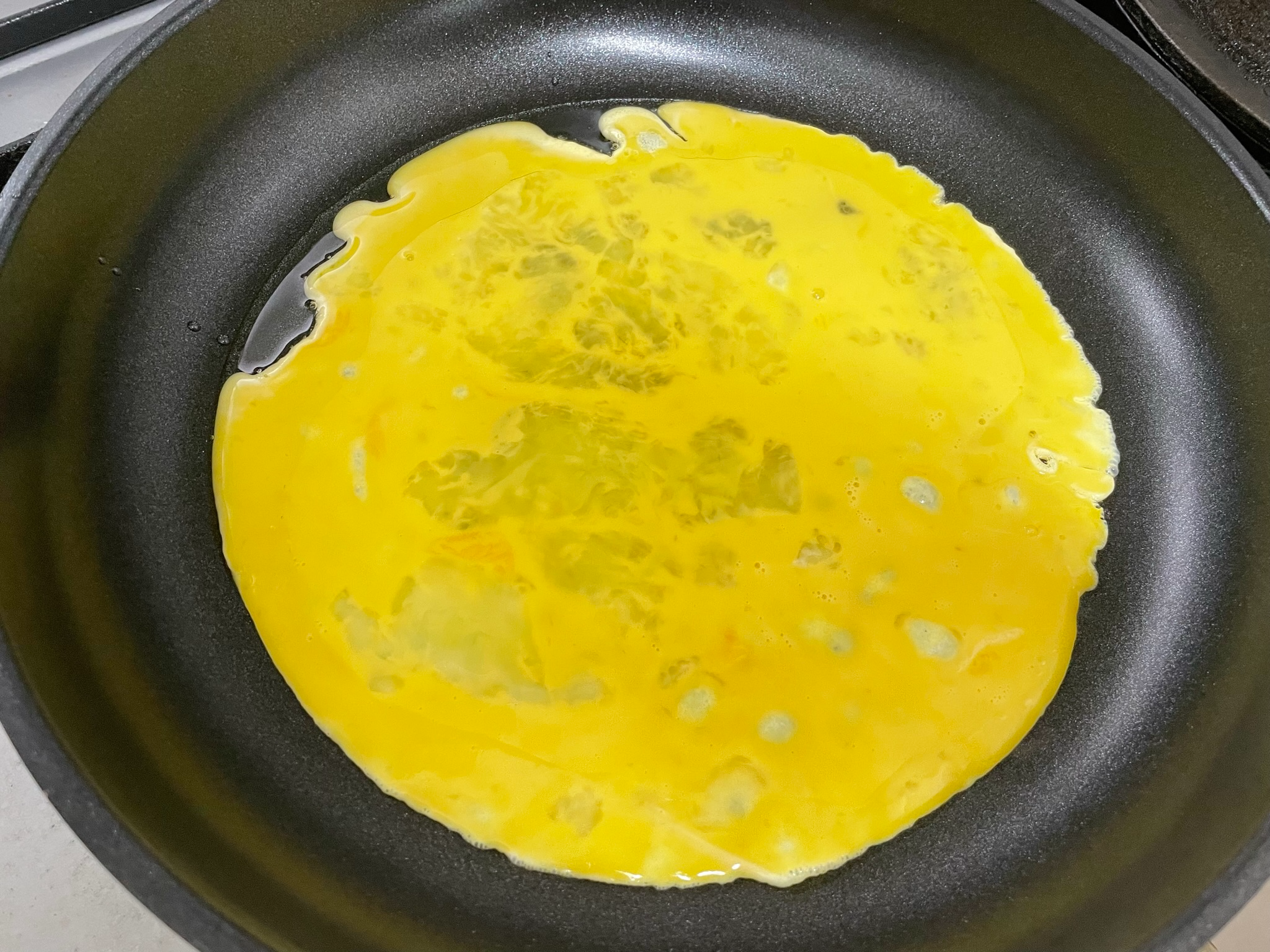 5. 계란물을 조금씩 프라이팬 전체에 퍼지도록 부어줍니다.