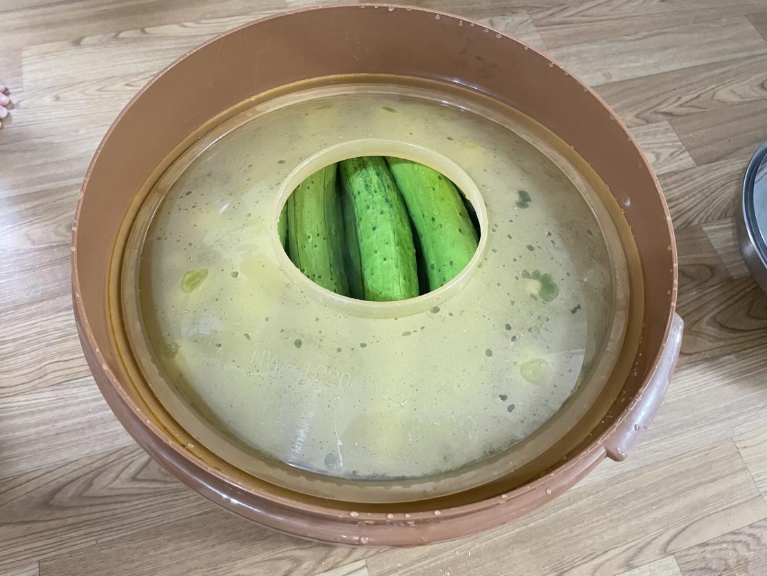 7 속 뚜껑을 닫고요. 무거운 돌을 올려놓습니다. 돌을 올려놓는 이유는 익으면서 오이가 숨죽으면 꼭꼭 눌러줘야 해요. 그래야 골마지가 덜 껴요. (골마지는 조금 껴도 괜찮아요. 익으면서 생기는 자연스러운 현상이에요.)