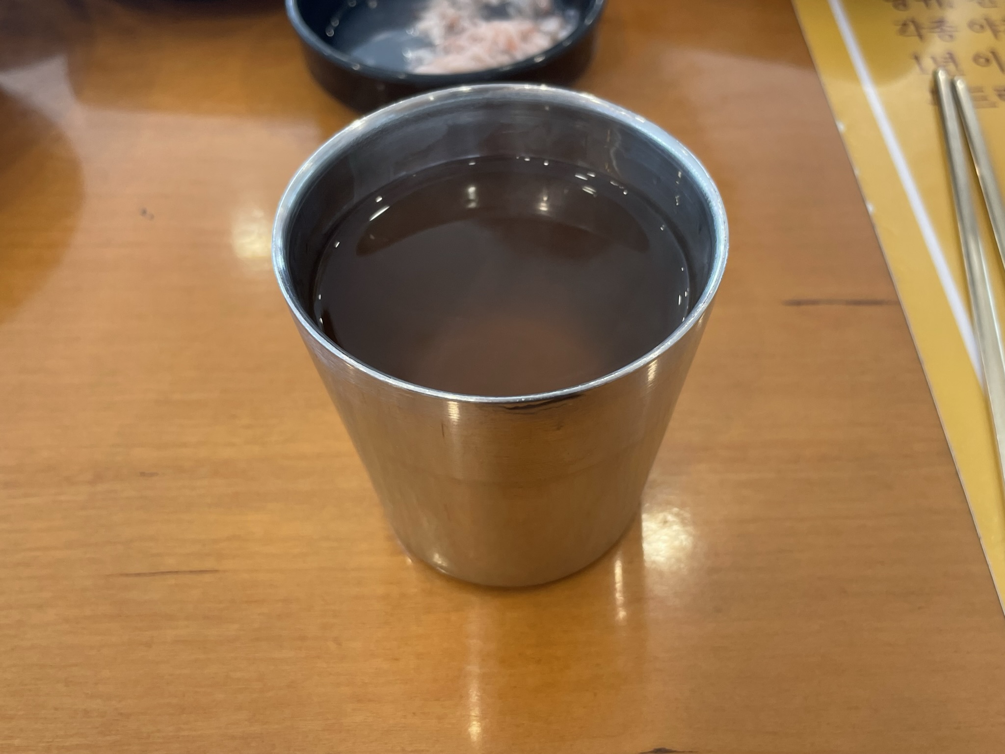 밀면이 차가워서 따뜻한 육수 한잔 먼저 마시면 감칠맛 나고 좋아요.