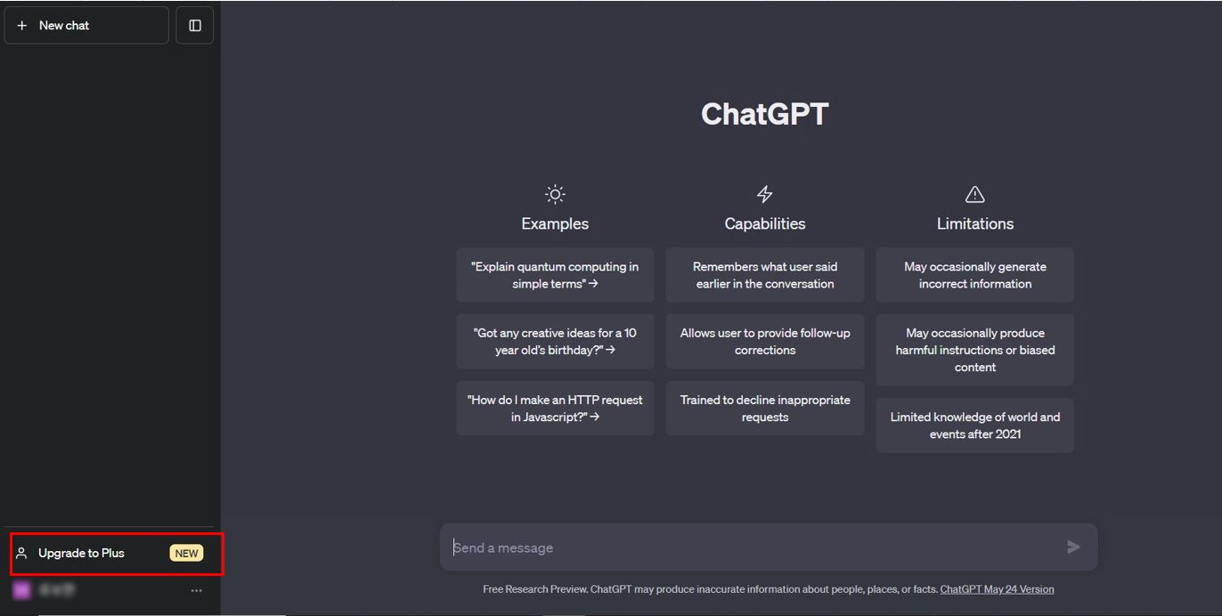 1. ChatGPT화면의 좌측 하단 Upgrade to Plus옆에 NEW를 누릅니다.
