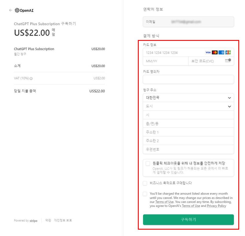 3. 결재정보를 입력 후, 아래 구독하기를 누릅니다. 매월 $22의 금액을 지불해야 합니다. (VAT 포함) 하단의 체크박스 중 아래와 같은 내용은 취소할 때까지 매달 자동으로 금액이 청구되며, 약관에 설명된 대로 가격변동이 될 수 있다. 언제든 취소할 수 있다. 이에 동의한다.” 이런 내용입니다.