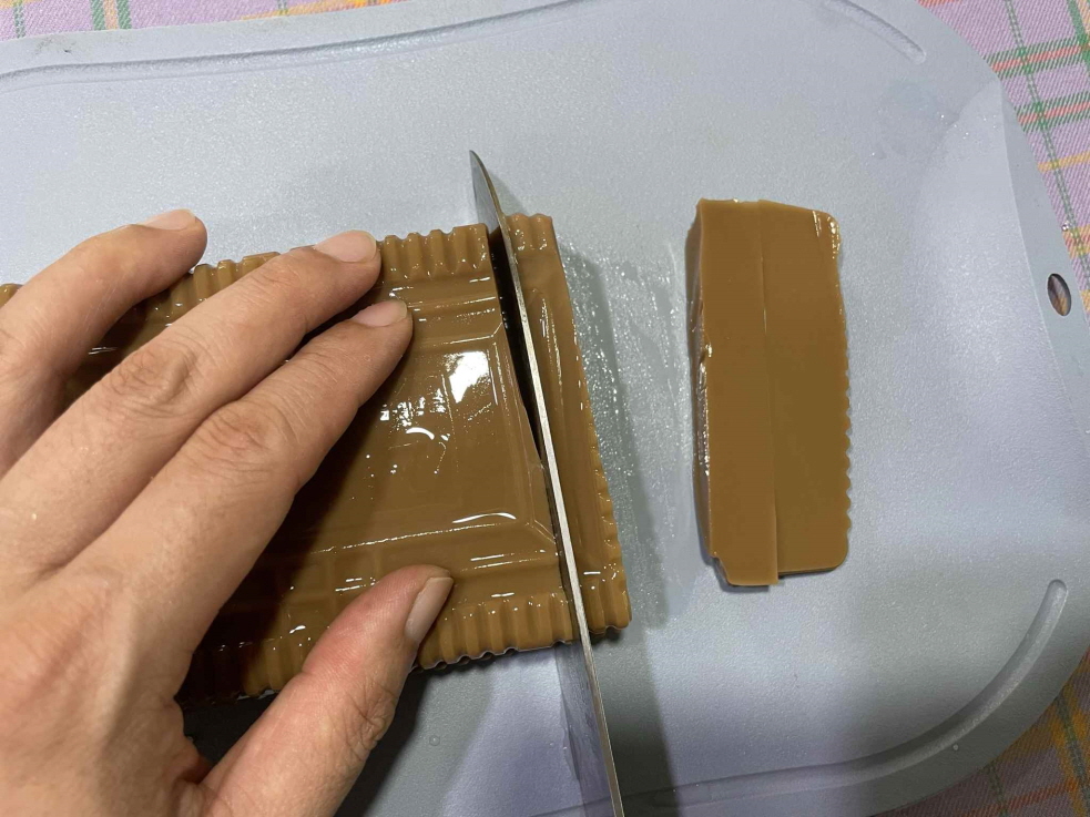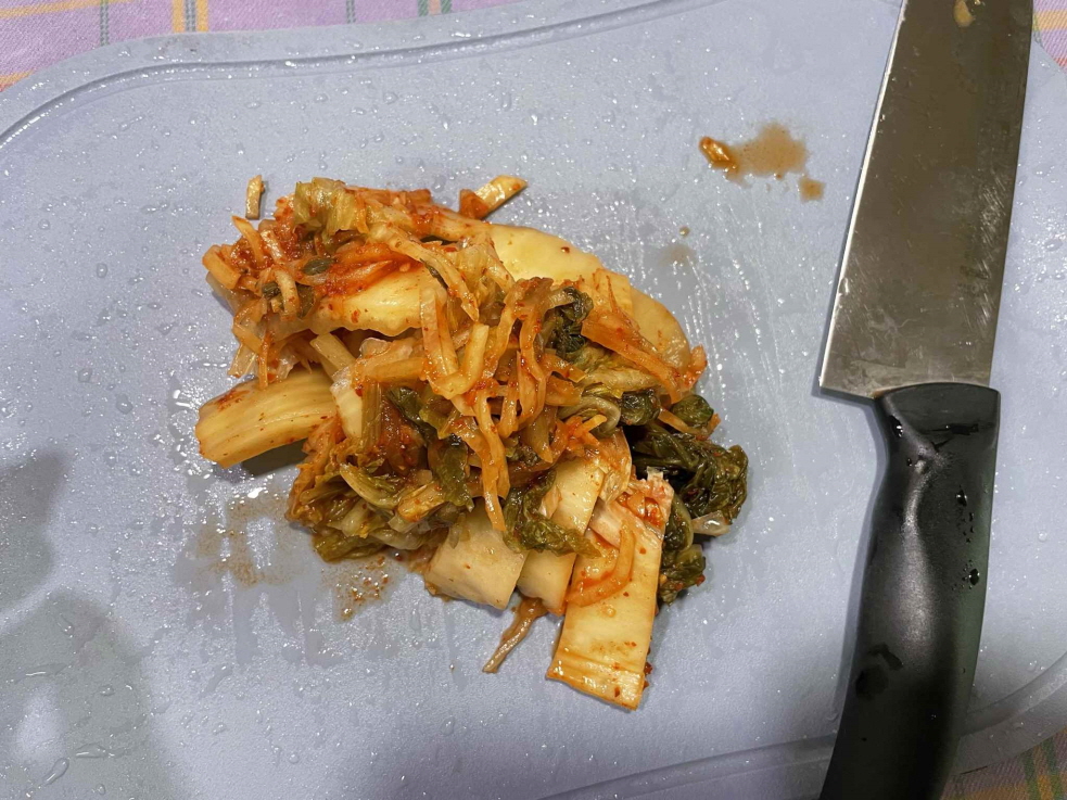 2. 김치를 작은 크기로 먹기 좋게 자릅니다. (두께 1Cm 정도)