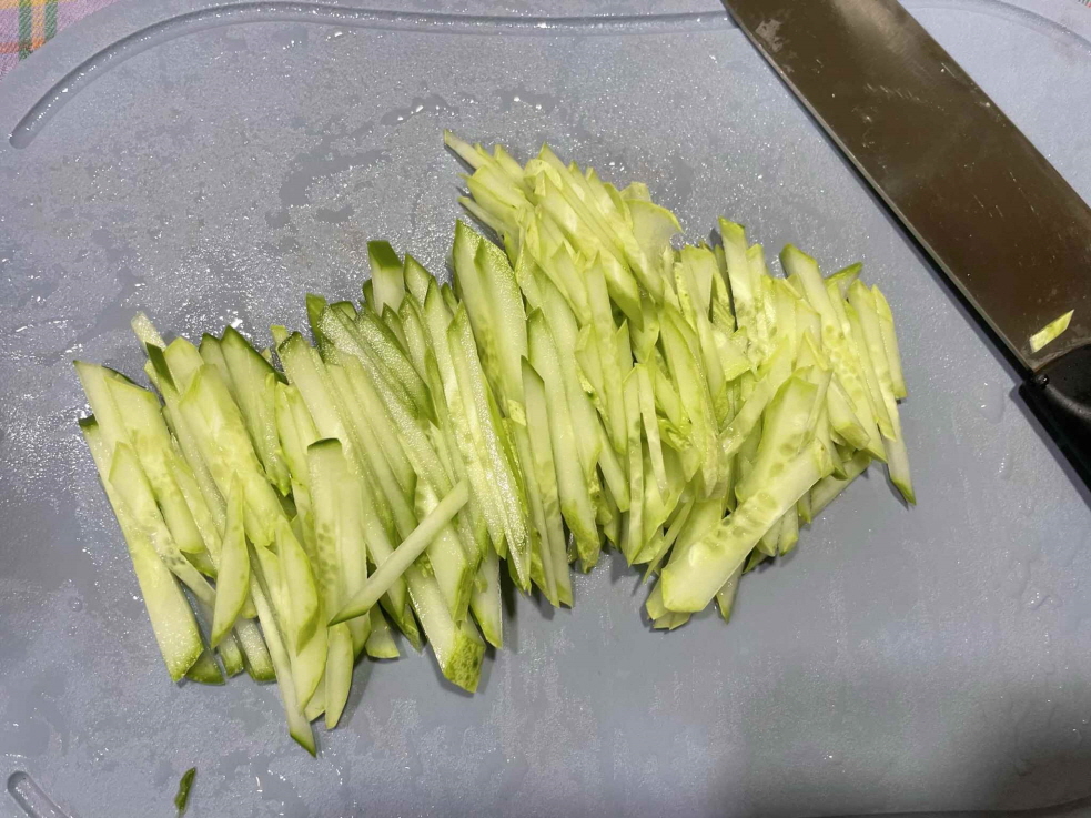3. 오이도 얇게 채 썰어 준비합니다.