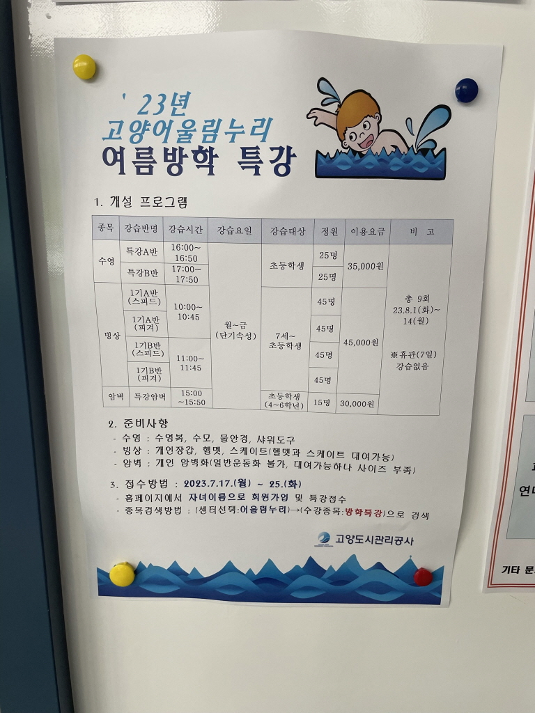 23년 여름방학 특강정보(수영, 빙상, 암벽) 입니다.