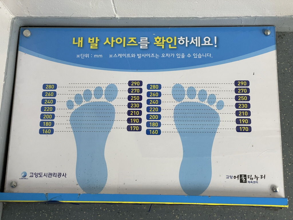 스케이트는 발에 딱 맞게 신어야 하기 때문에 운동화 사이즈보다 10mm 작게 신으면 됩니다.