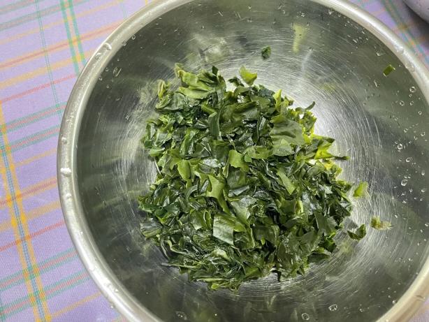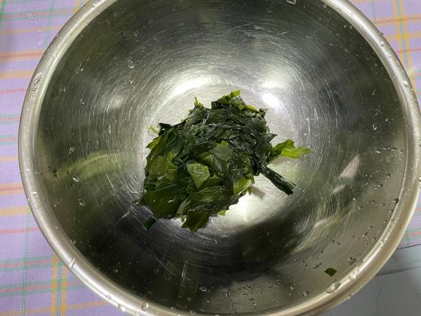 2. 불린 미역을 물에 헹구고 꽉 짜서 작게 잘라줍니다.