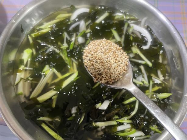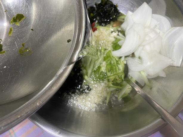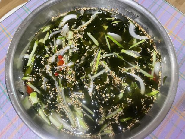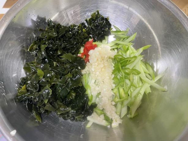 미역 빼고 오이만 넣어도 되지만 미역을 넣으면 더 감칠맛 나고 든든한 것 같아요