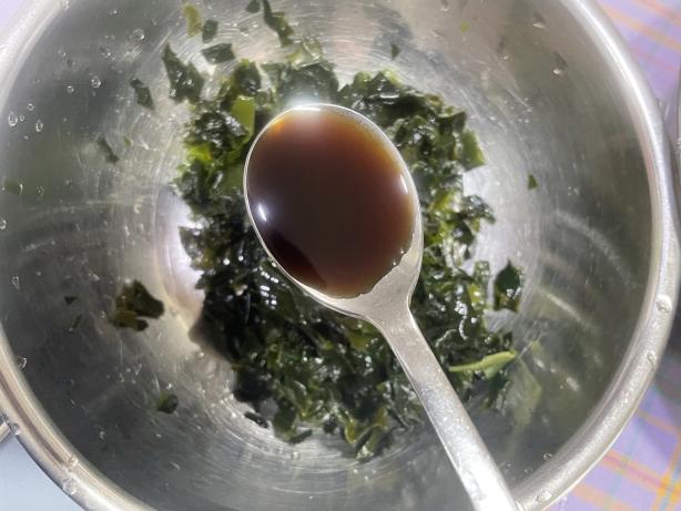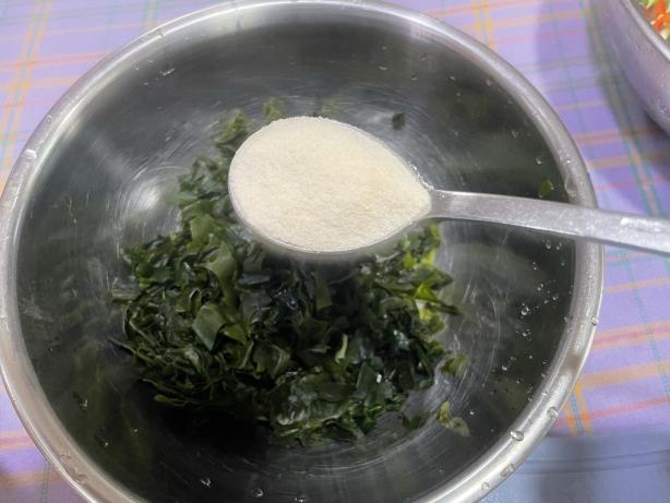 3. 자른 미역에 설탕, 식초, 국간장, 액젓을 넣고 섞어줍니다.