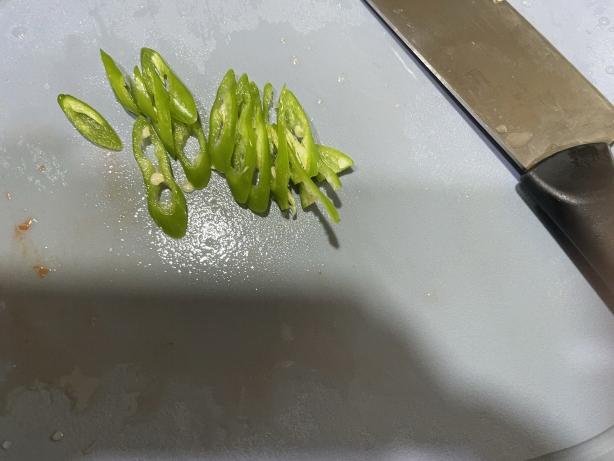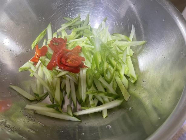 5. 채 썰어 놓은 오이에 청양고추와 홍고추를 잘라 넣어줍니다. 청양고추는 두 개 넣어도 되지만 냉국이 너무 매우면 식감이 떨어질 수 있어요. 기호에 맞게 넣으면 됩니다.