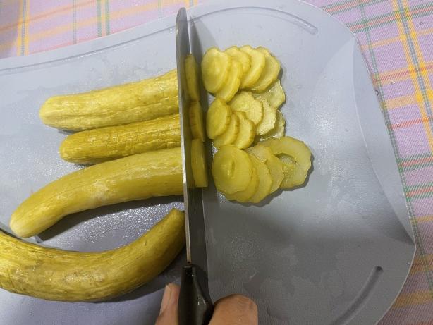 1 오이지를 물에 씻어서 2~3mm 정도 두께로 쓸어 준비합니다.