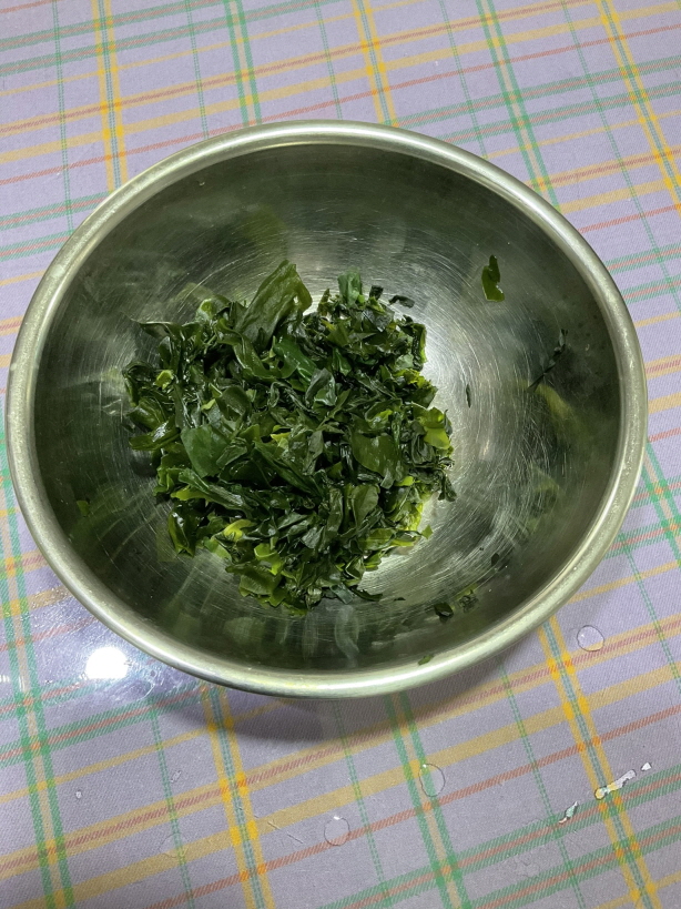 2. 불린 미역을 먹기 좋게 작은 크기로 잘라 줍니다.