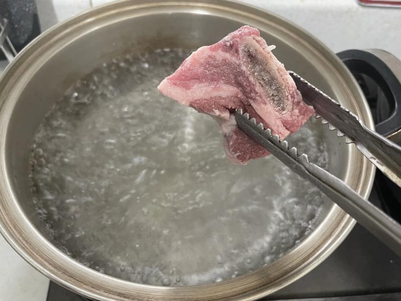 저는 시간 없어서 그냥 끓는 물에 고기를 모두 넣고 5분간 끓였어요. 이렇게 하면 고기 겉면이 익으면서 핏물이 나오지 않게 됩니다. (갈비탕 끓이면서 맑은 국물을 만들 수 있어요.)