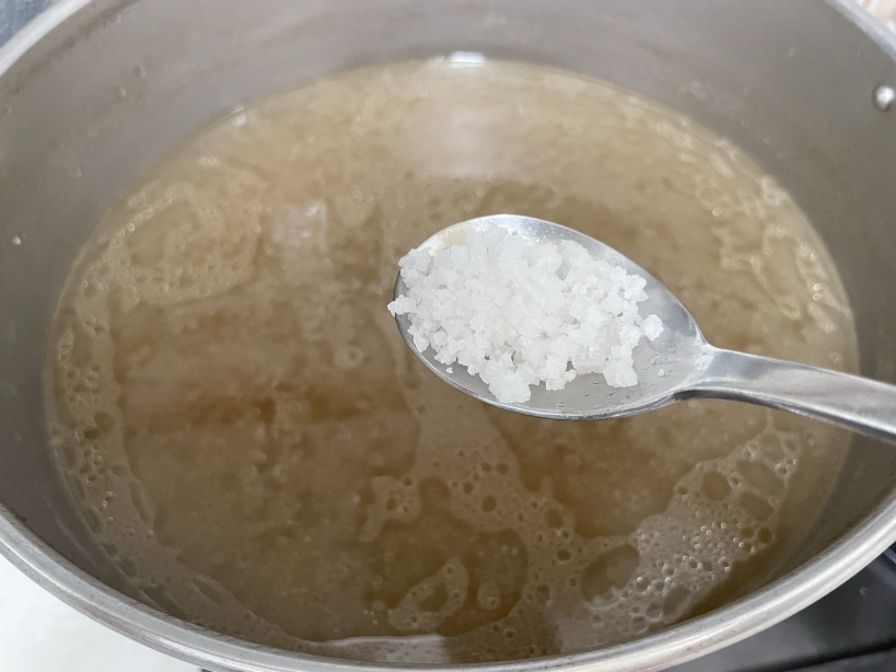 13.  소금으로 간을 맞춥니다. 3큰술 이상 넣어야 적당합니다. 기호에 맞게 간을 보며 소금을 넣습니다.