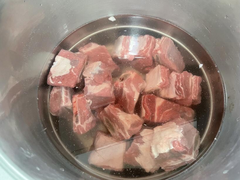 1.     갈비찜용이나 갈비탕용 고기를 찬물에 담가 놓고 핏물을 빼 줍니다.(2시간 정도)