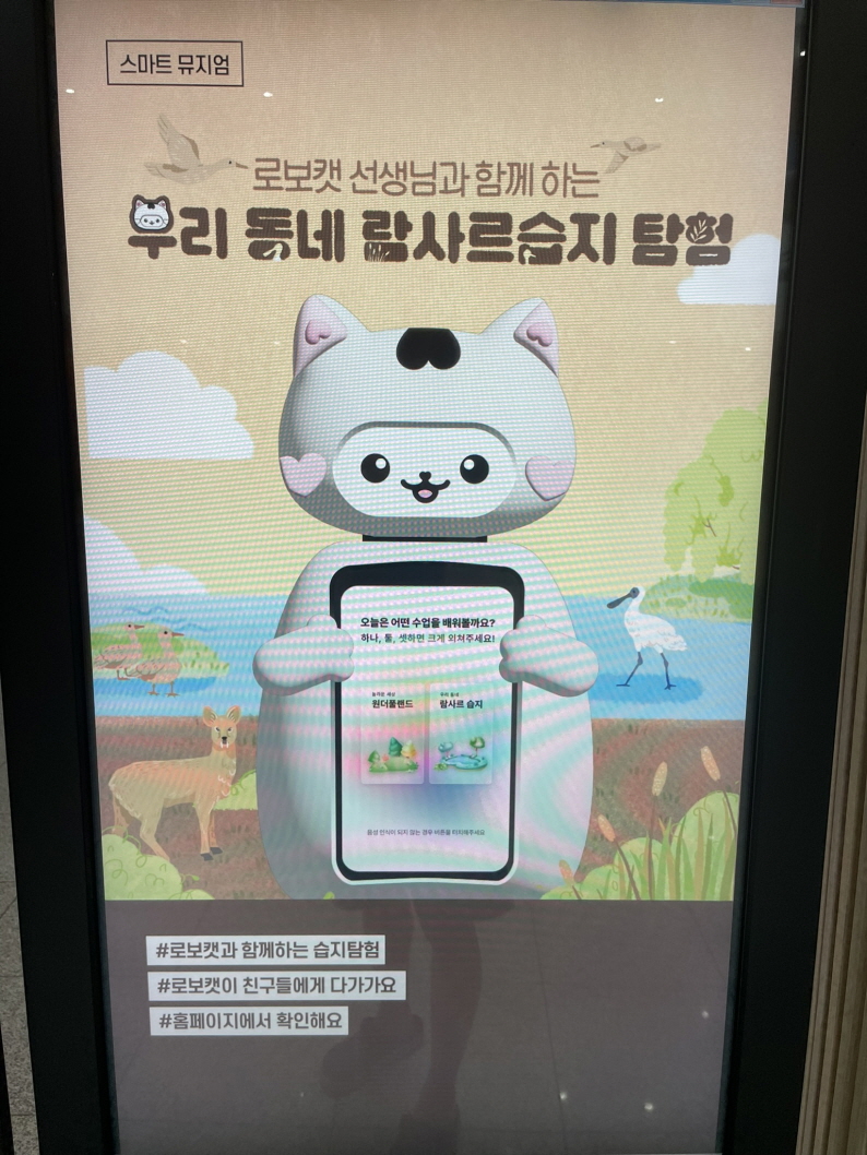박물관 1층 주차장 쪽 입구에 쉬고 있는 로보캣과 함께 고양시의 람사르습지 장항습지를 소개하는 환경교육 프로그램입니다.