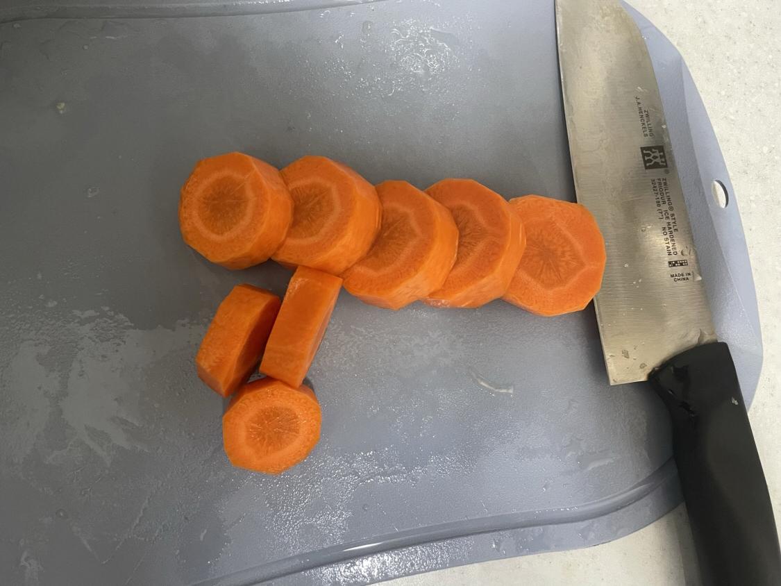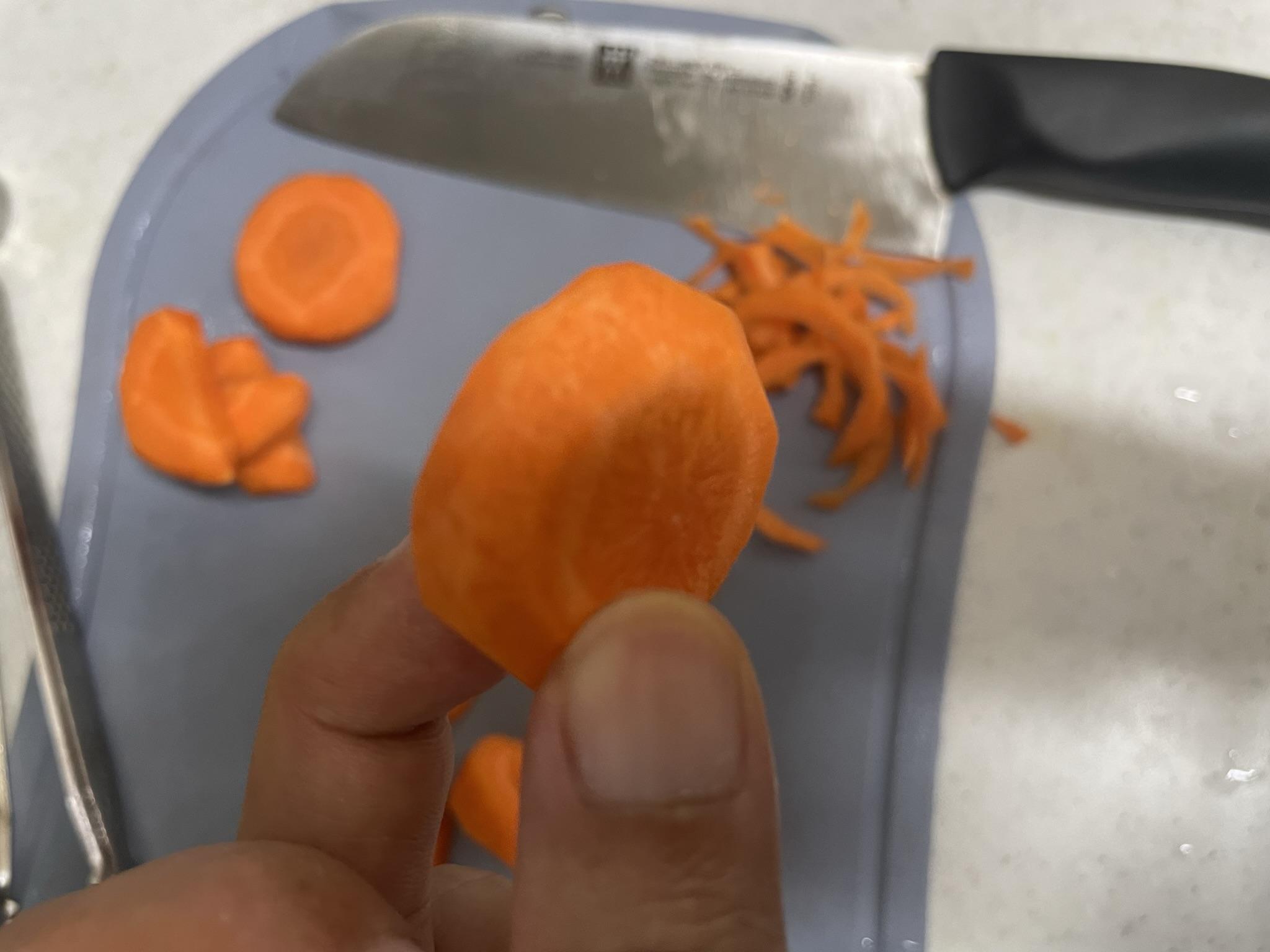 10. 양파, , 당근을 크게 잘라줍니다. 무와 당근은 동글동글하게 모서리를 깎아내면 갈비찜 완성했을 때 보기 좋아요.