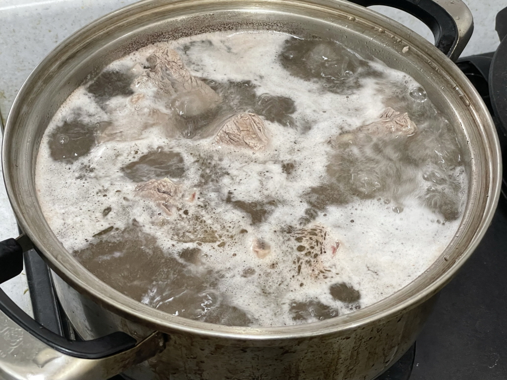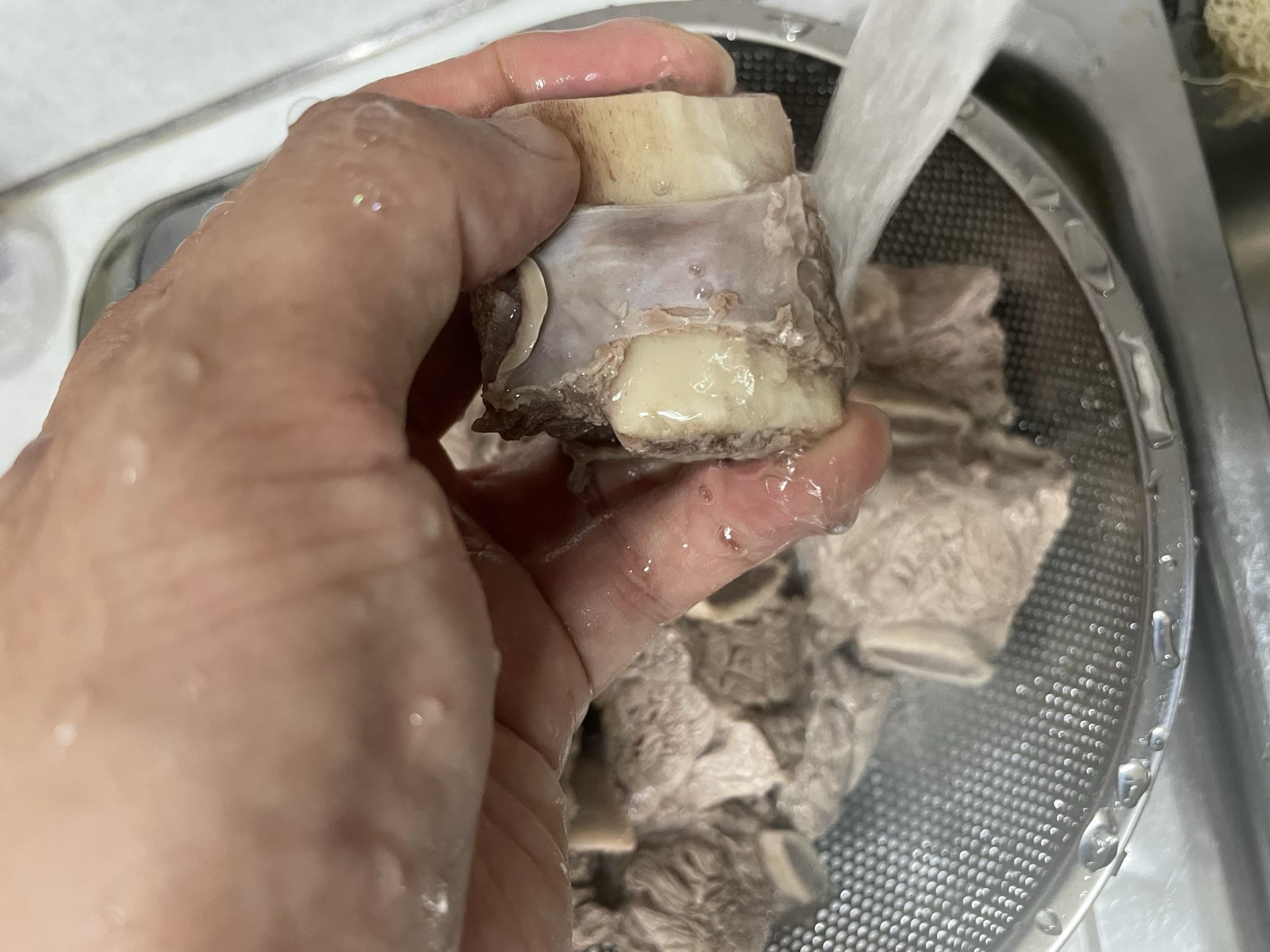 2. 5분 동안 끓인 고기를 찬물에 씻습니다. 손으로 뼈에 붙은 선지나 찌꺼기를 닦아냅니다.
