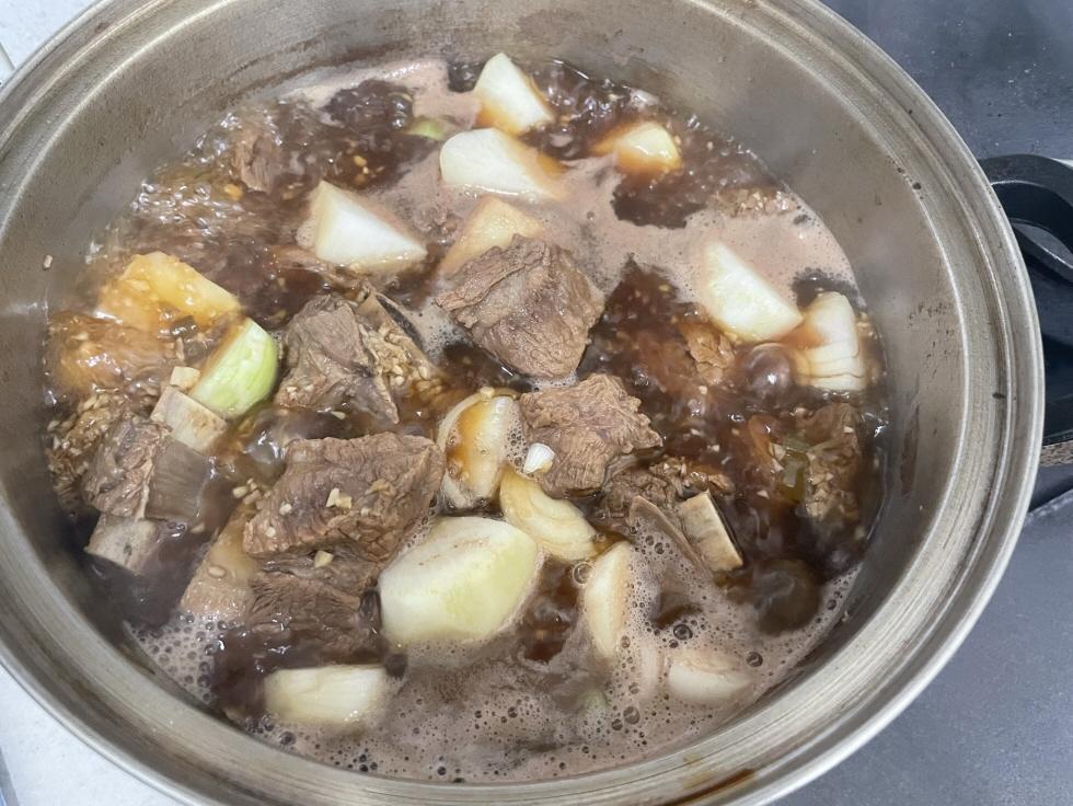 6. 40분간 끓입니다. 여유가 있으면 더 오래 끓일수록 양념이 고기에 배고 고기가 부드러워집니다. 뚜껑을 닫고 끓이세요. 뚜껑을 닫고 끓이면서 열기가 빠져나가지 않게 푹 찌는 겁니다. 물기가 증발되서 졸았으면 물을 더 부어주세요.