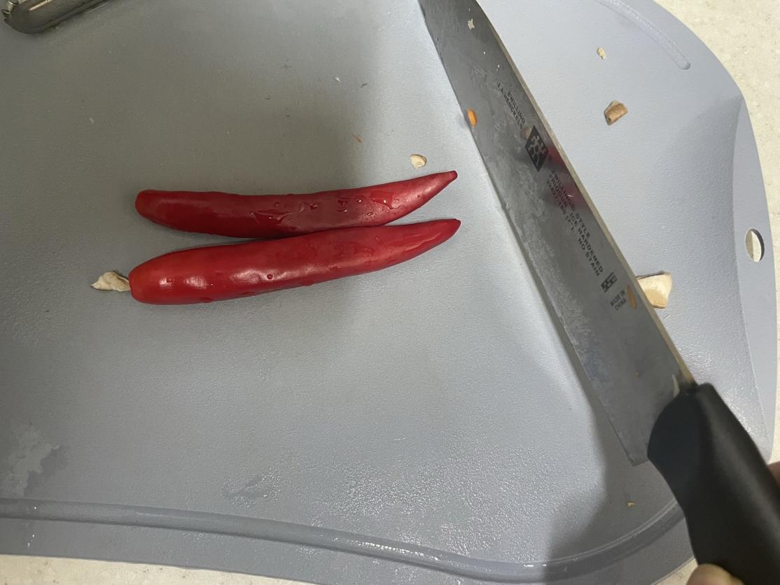 9. 홍고추, 청양고추, 꽈리고추를 한입 크기로 잘라줍니다. 청양고추는 3개 또는 2개 넣습니다. 아이들이 있거나 매운 거 잘 못 드시는 분들은 2개만 넣어도 됩니다.
