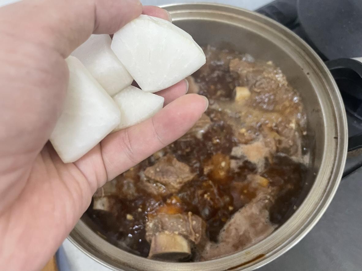 12. 40분 이상 양념에 끓였으면 무와 양파를 넣고 15분 추가로 끓입니다.