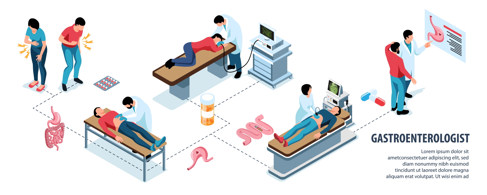 - 의사는 식도, 위, 십이지장을 살펴보기 위해 얇고 유연한 특성이 있는 튜브(내시경)를 환자의 구강을 통해 소화기에 삽입합니다.