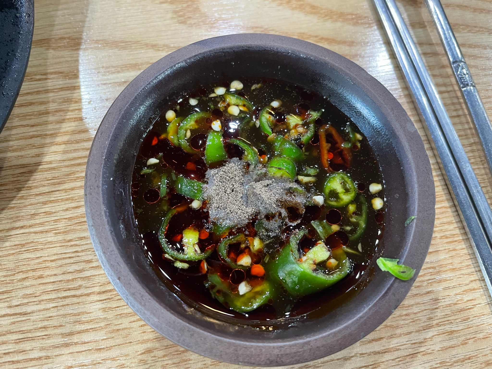 각자 먹는 방법은 다르지만 제가 먹는 방법은 기본 반찬으로 나오는 반찬 중에, 고추를 종지에 담고 간장소스, 고추씨기름, 후추를 넣어 소스를 만든 후 고기와 선지를 찍어 먹으면 맛있습니다.
