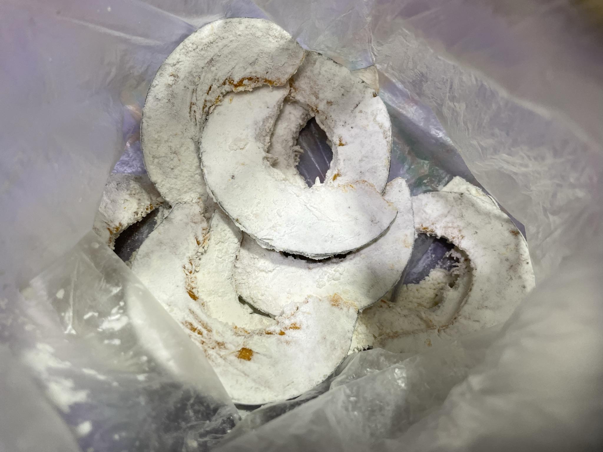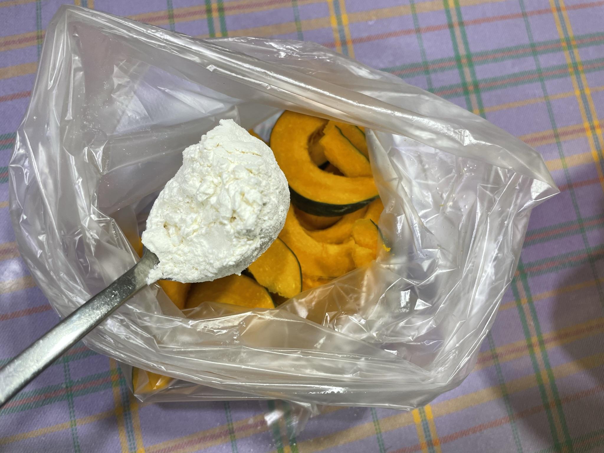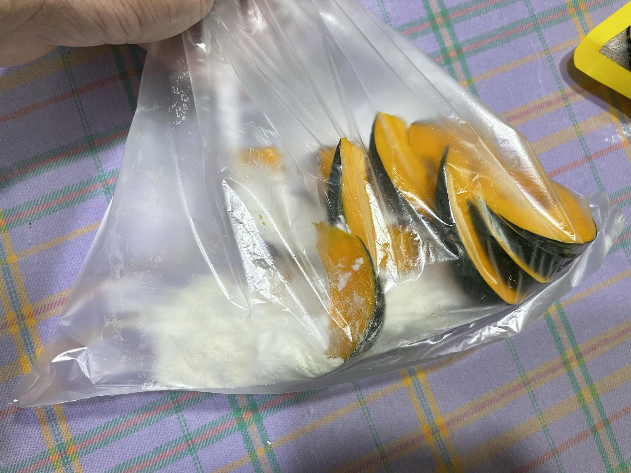 4. 깨끗한 비닐봉투에 넣고 튀김가루 한 스푼을 넣은 후 비닐봉투를 흔들어 단호박에 튀김가루가 잘 묻게 합니다.