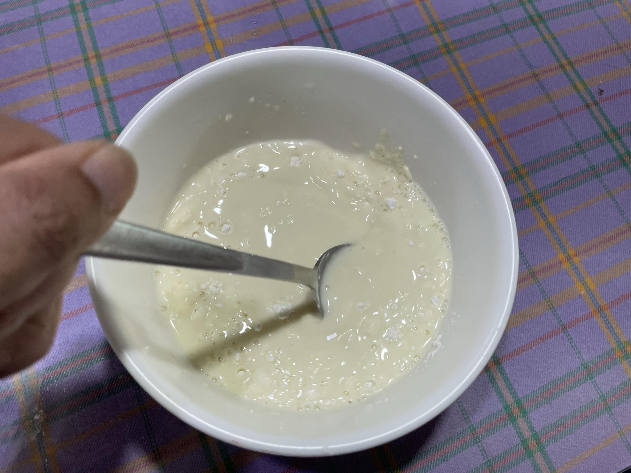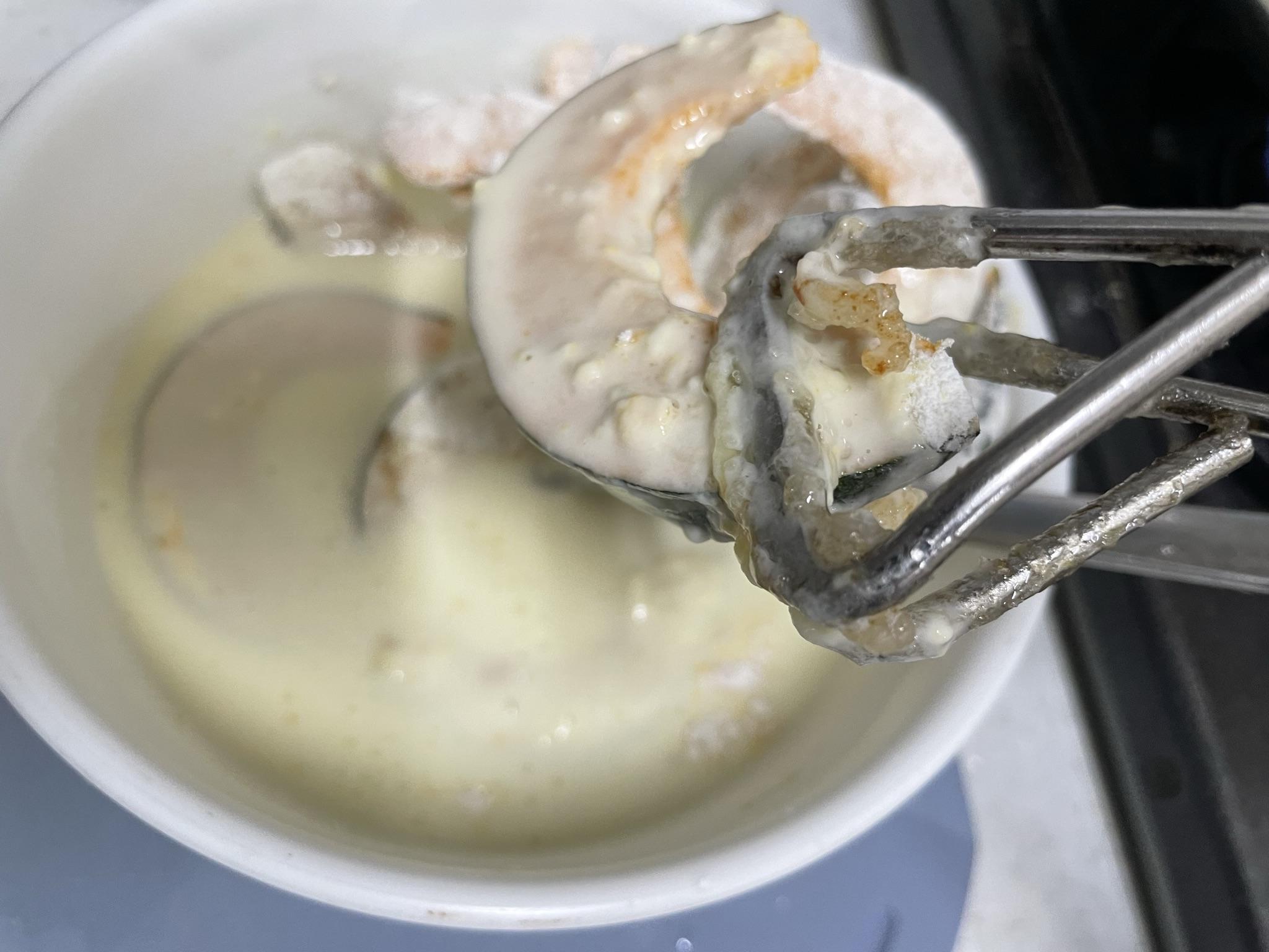 5. 튀김물은 튀김가루 1컵, 물 1컵 넣고 잘 섞어줍니다. 얼음을 넣고 섞으면 튀김이 더 바삭해져요.