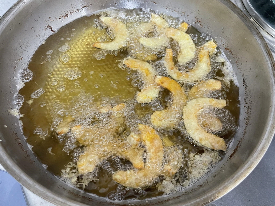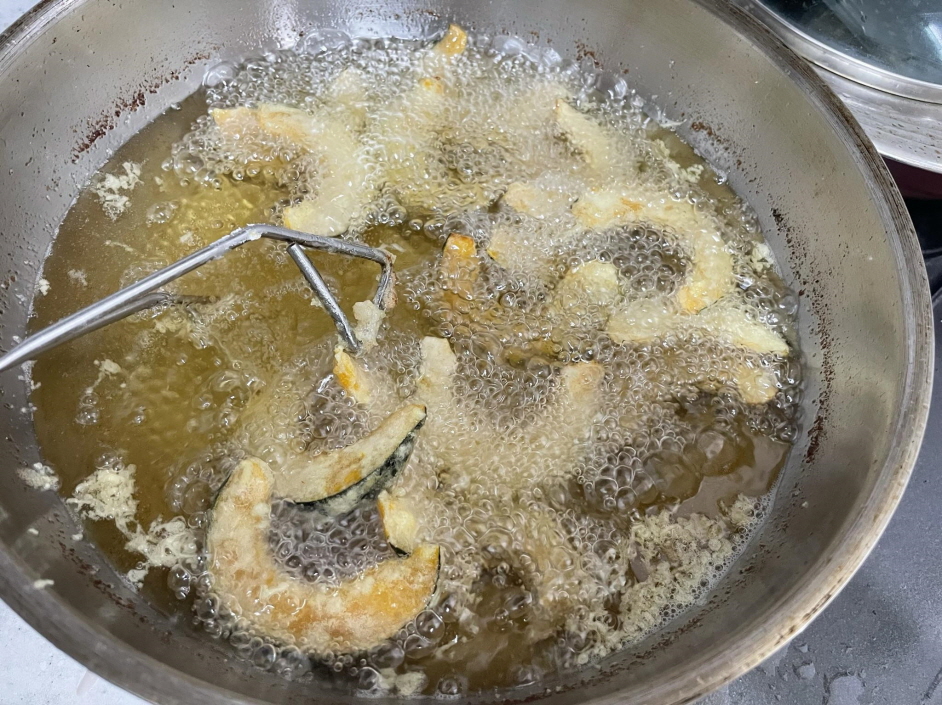 7. 기름온도 170도 정도 되면 단호박을 튀김물에 담근 후 기름에 넣고 튀깁니다.