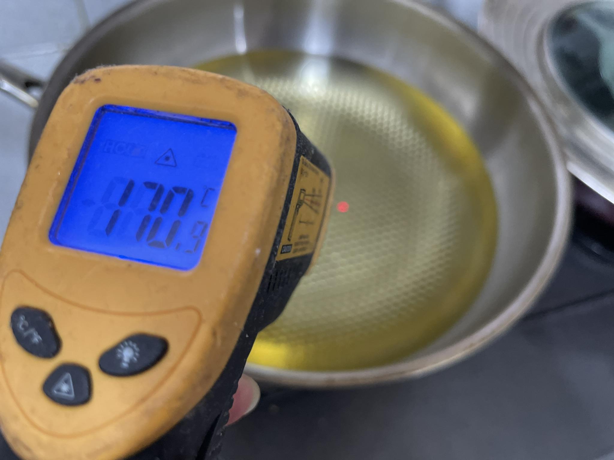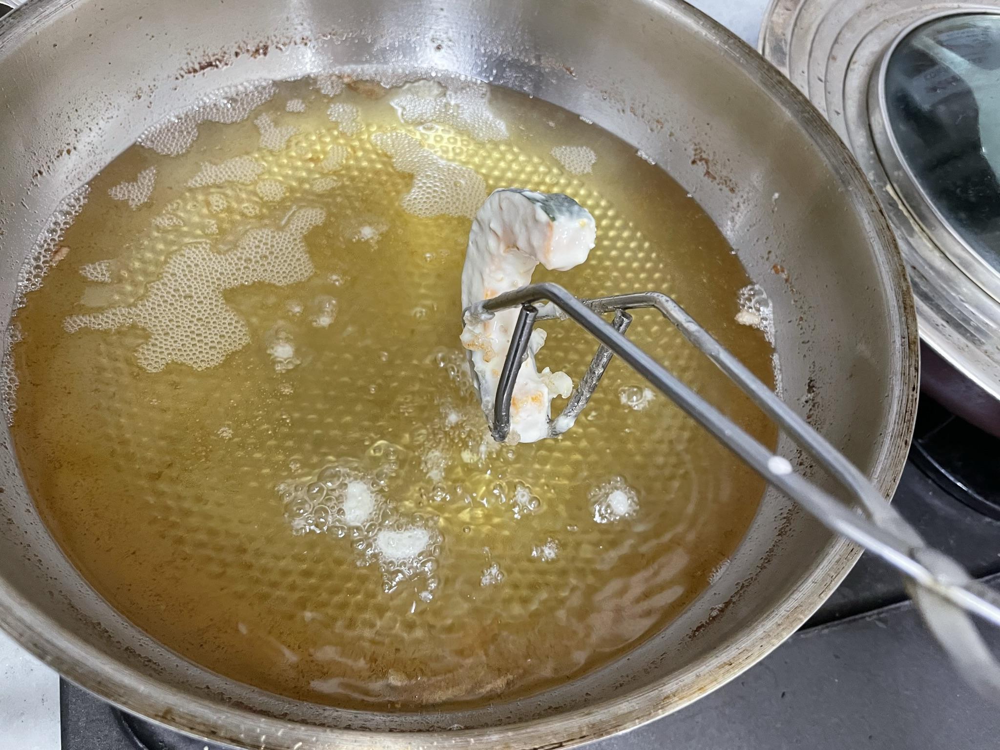 8. 처음에는 많이 부글부글 튀겨지다가 약 2~3분 정도 튀기면 부글부글 하는 정도가 덜해져요. 그럼 다 익은 거예요.