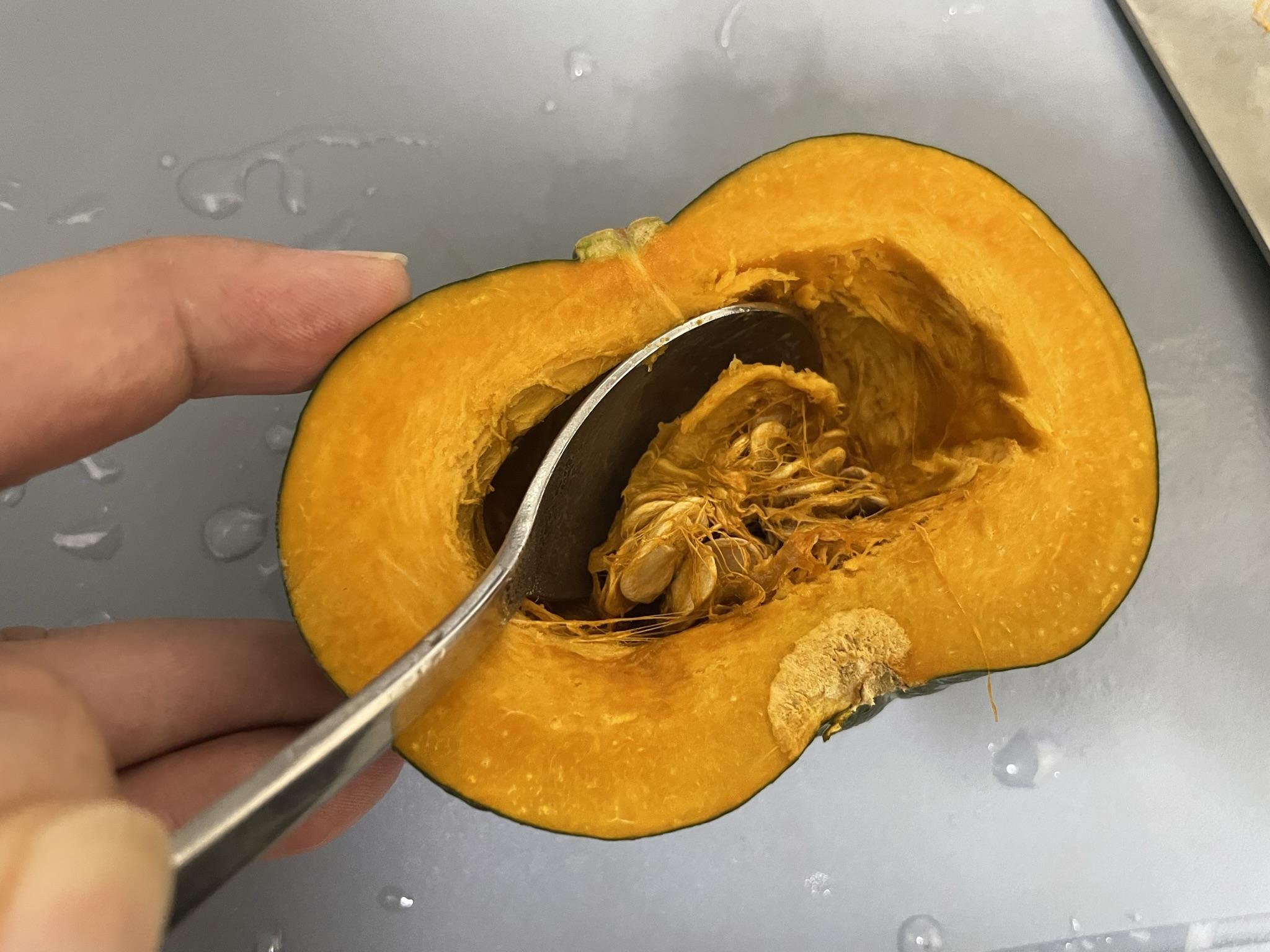 2. 미니단호박을 반 자르고 숟가락으로 씨를 파냅니다.