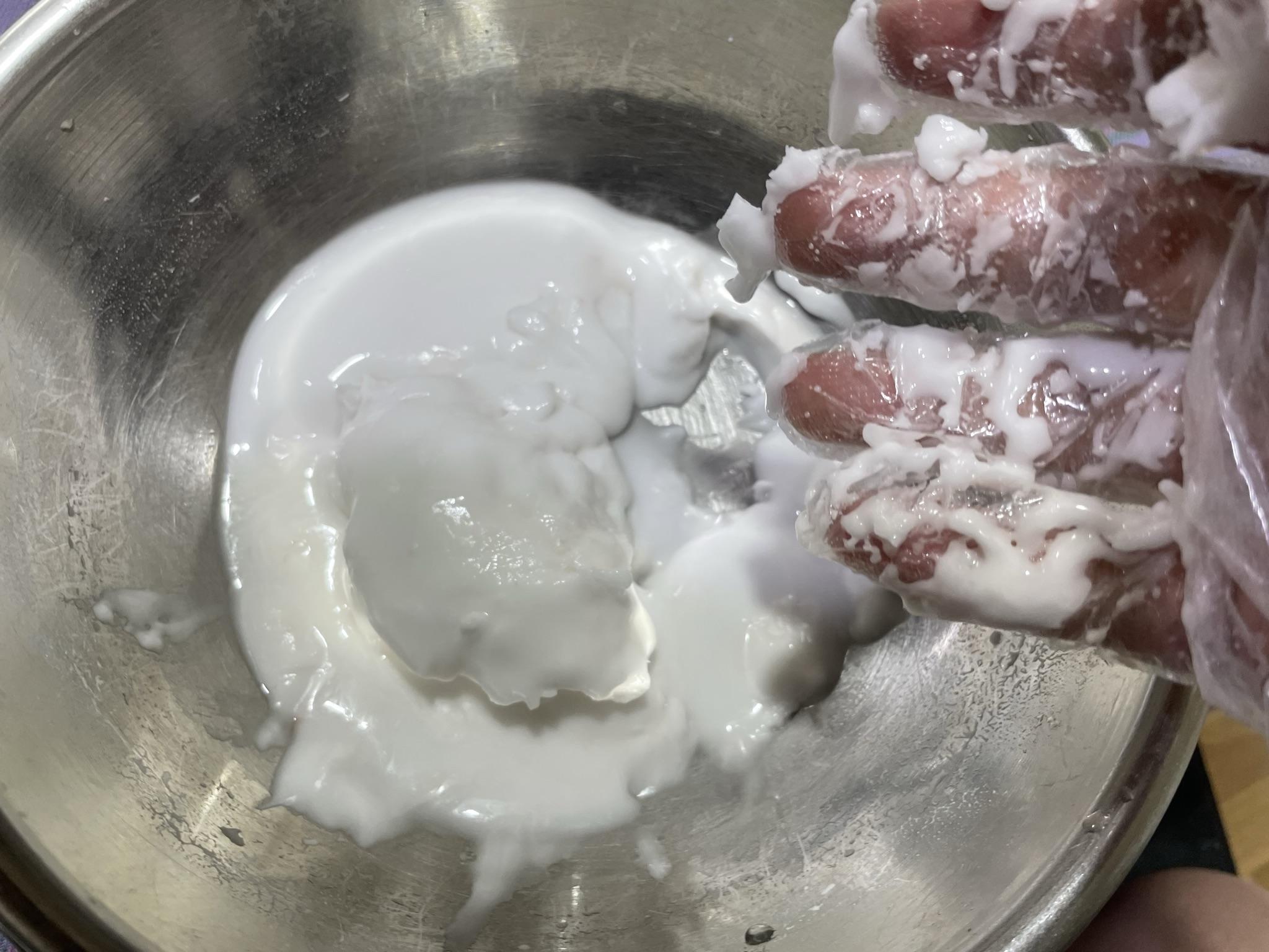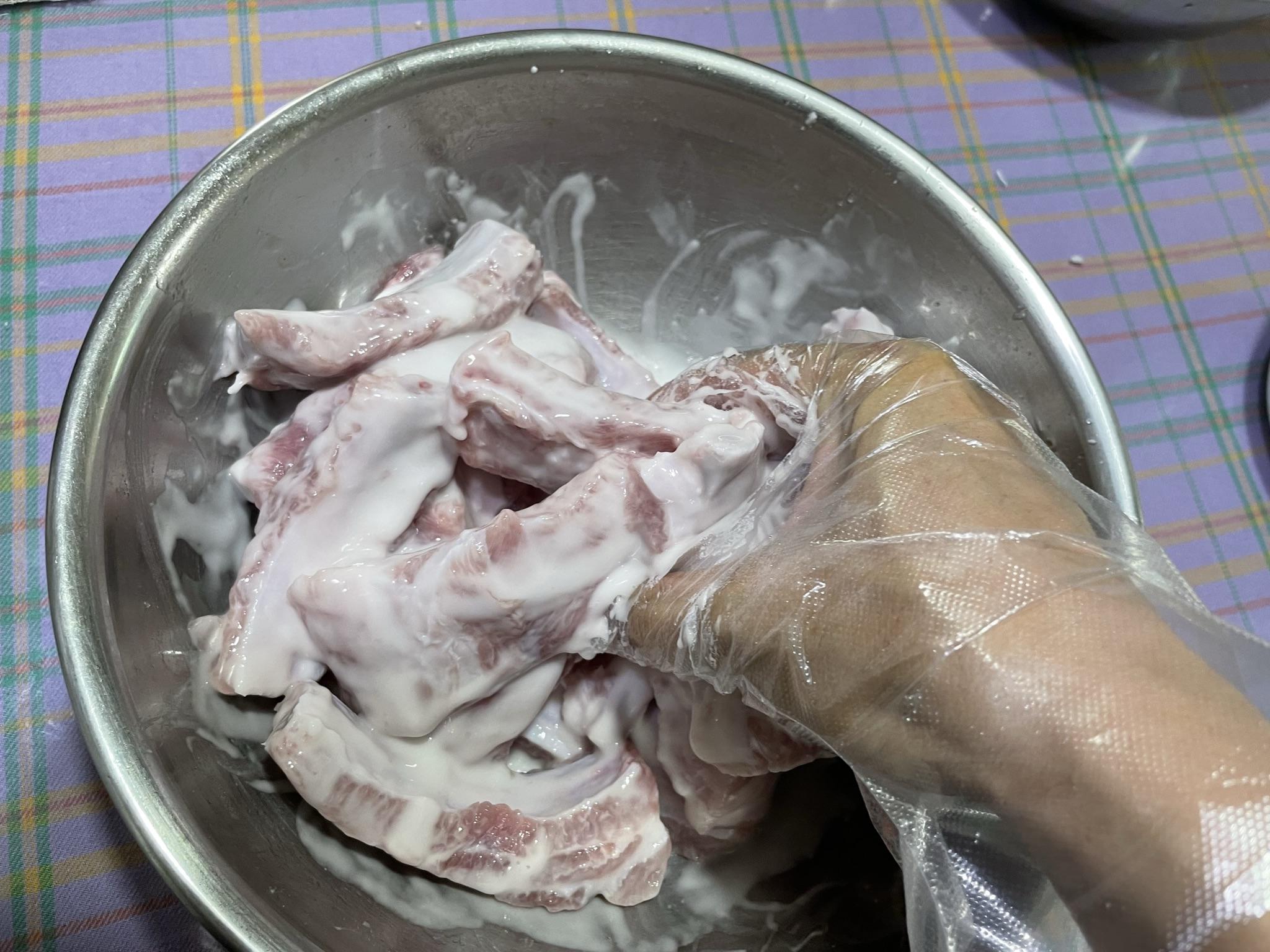 6. 굳어 있는 전분을 손으로 만지면 다시 녹습니다. 녹은 전분 반죽을 등갈비에 부어 섞어줍니다.