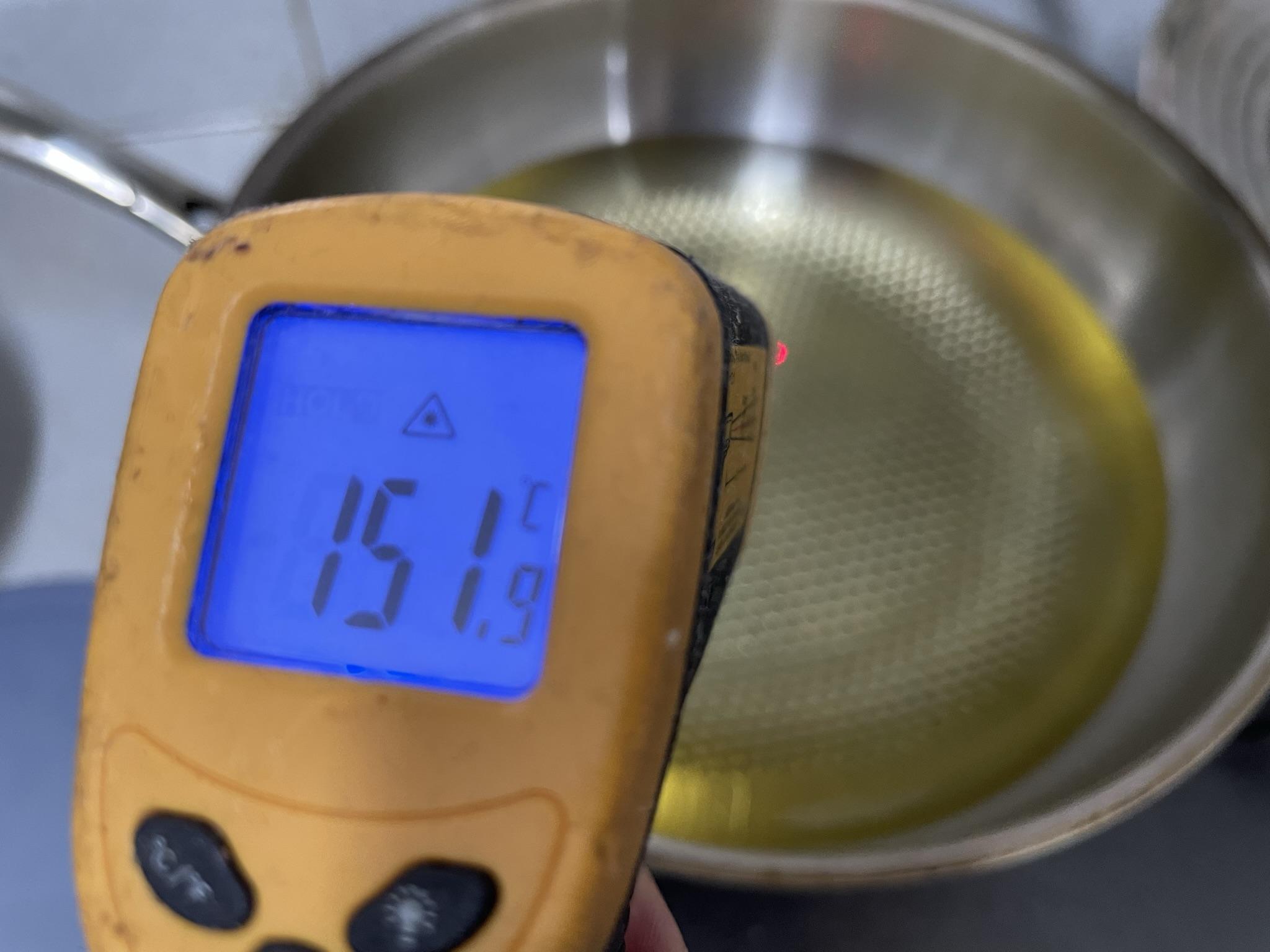 7. 팬에 식용유를 부어 가열합니다. 140~150도 정도(기존 튀김기름 온도는 170) 조금 낮은 온도로 가열하여 오래 튀겨줍니다. 등갈비에 묻어 있는 전분 반죽은 금방 흐르기 때문에 기름에 넣을 때마다 버무려준 후 기름에 넣어 튀깁니다. 기름에 넣었을때 처음에는 기름에 가라앉아 바닥에 붙을수 있으니 떼어냅니다. 14분정도 튀긴 후 건져내면 완성입니다.
