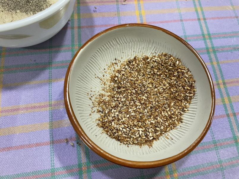 2. 통깨를 절구에 갈아서 섞으면 찍어 먹는 양념 가루 완성입니다.