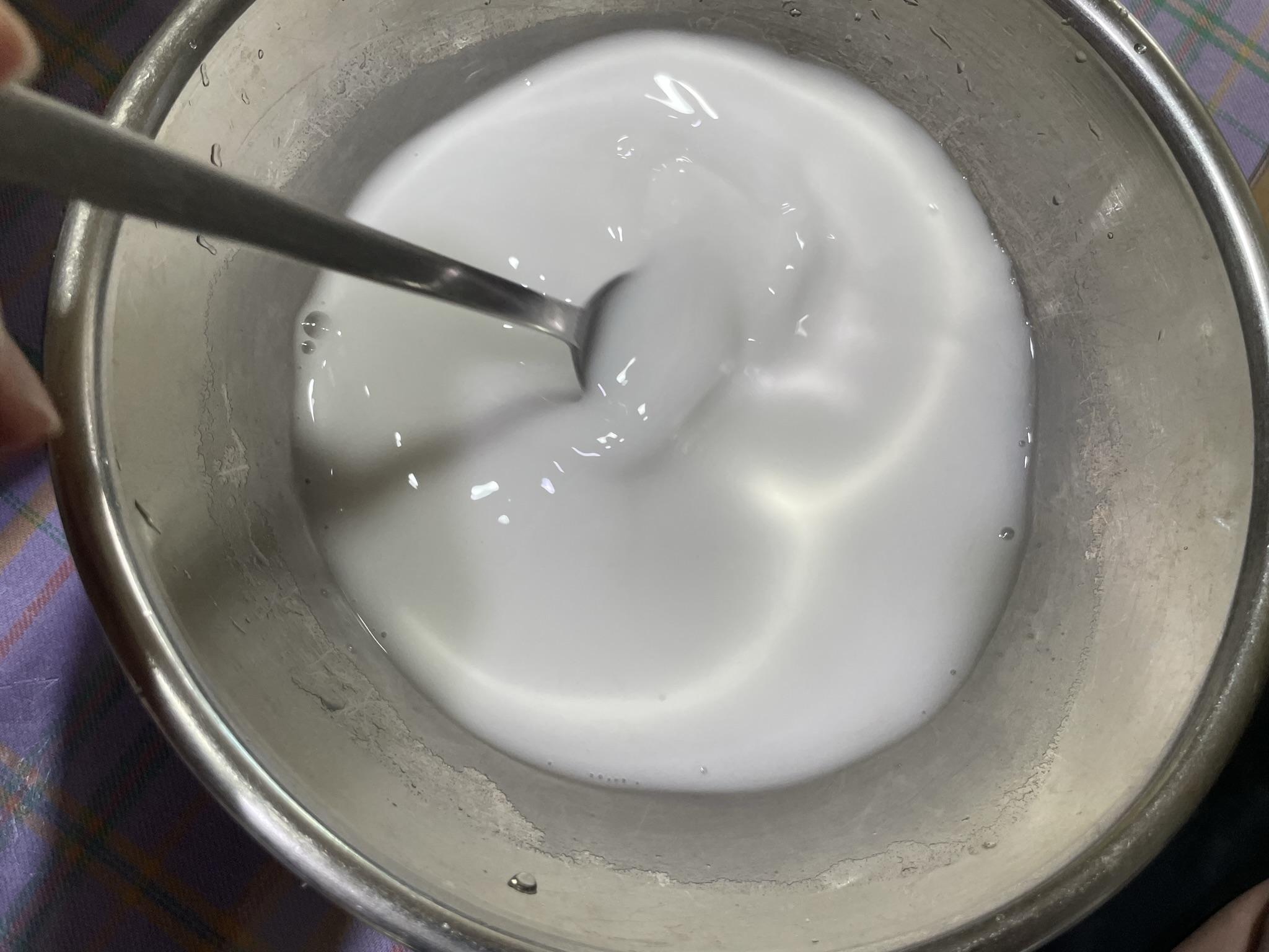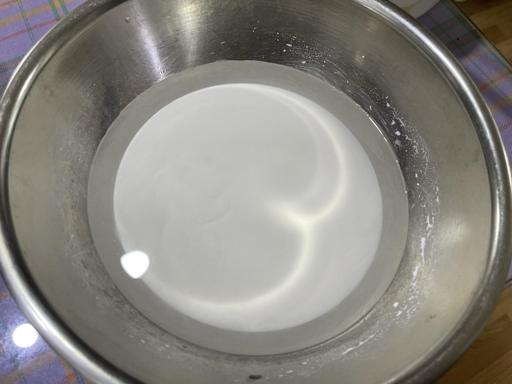 5. 20분 후 전분은 바닥에 가라앉아 굳어 있고, 물만 위로 떠오릅니다. 2큰술정도 남기고 나머지는 따라버립니다.