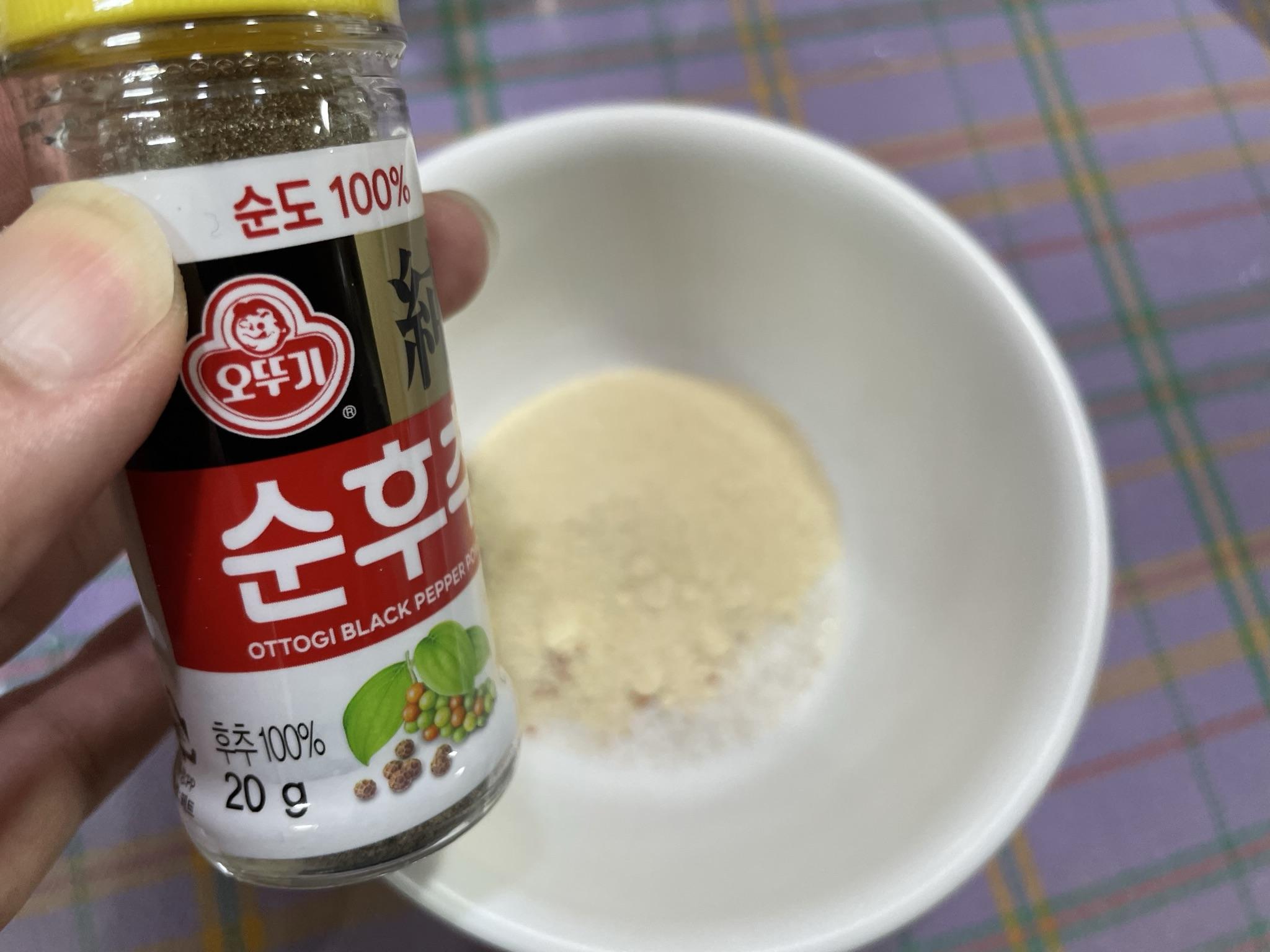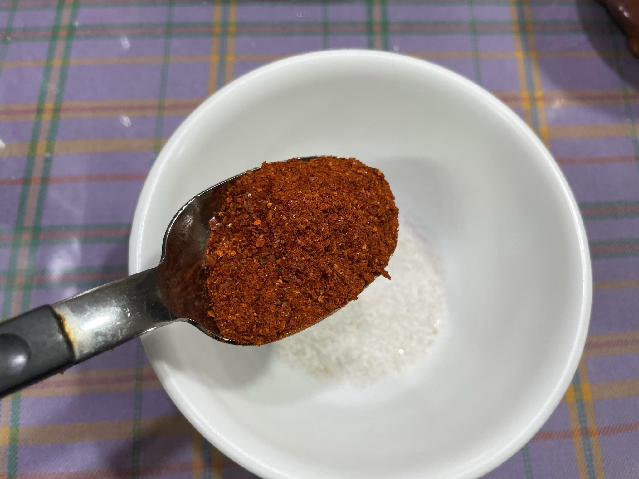 1. 소금, 고춧가루, 설탕, 후춧가루, 큐민 가루를 섞어줍니다.