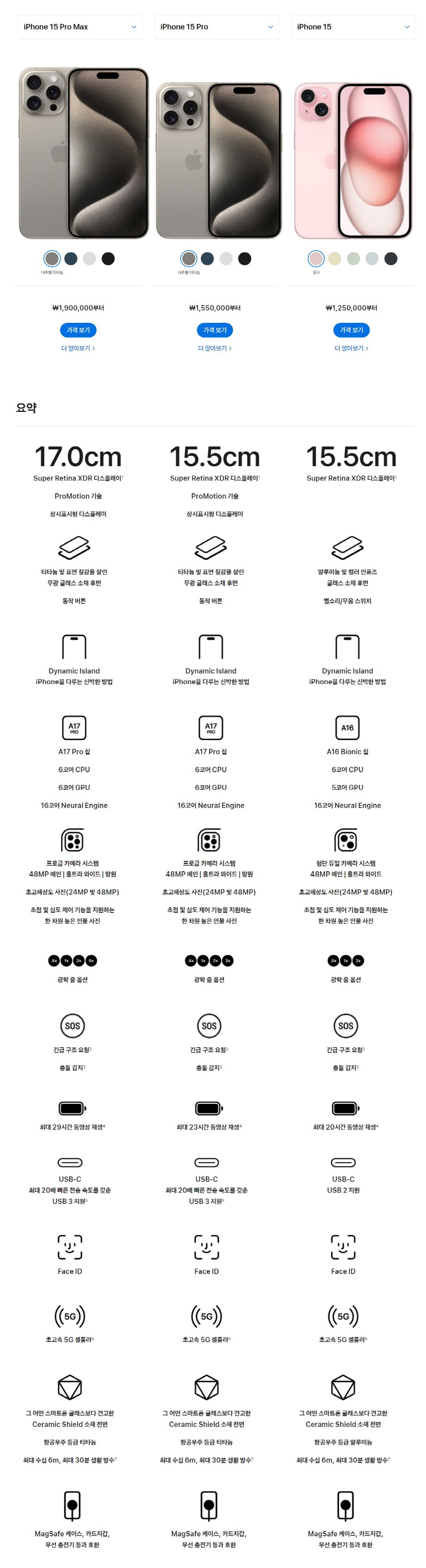 아래 아이폰15ProMax, 아이폰15Pro, 아이폰15, 아이폰15Plus 가격 및 사양비교 참고바랍니다.