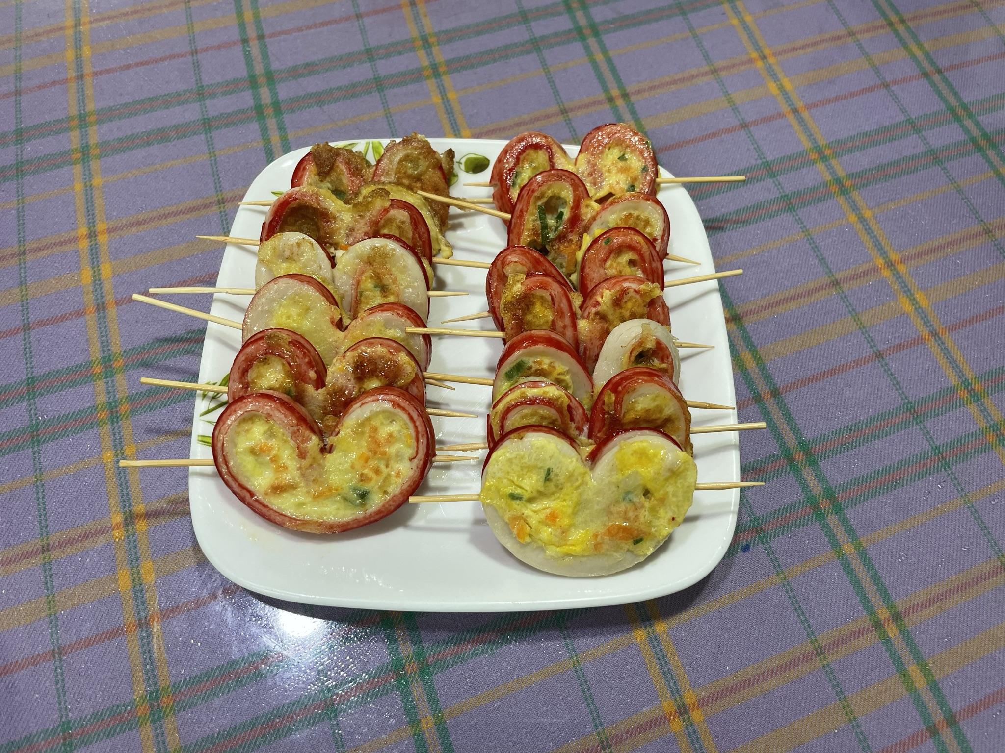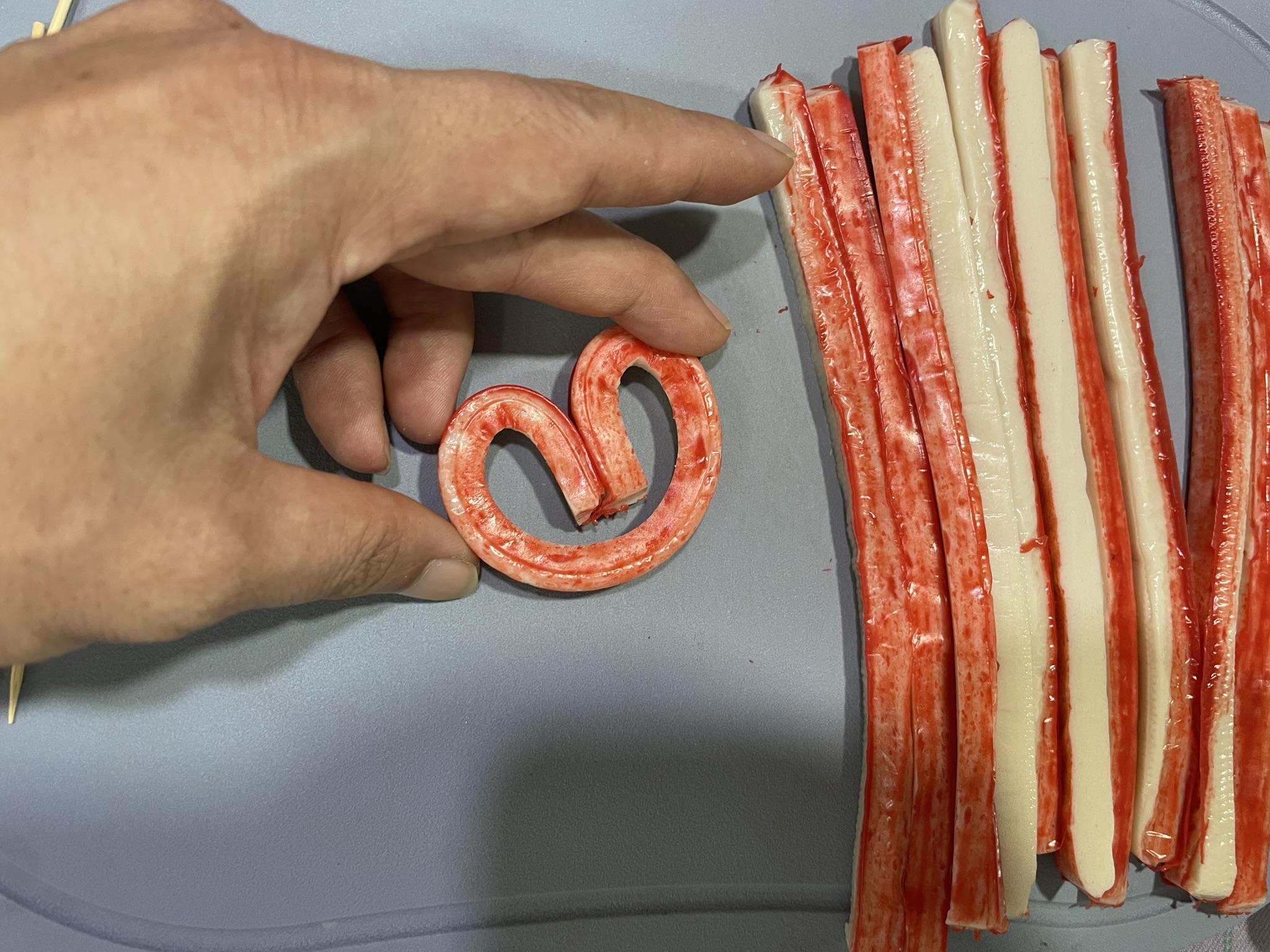 2. 나눈 맛살을 하트 모양으로 구부려 만든 후 산적꼬치로 고정합니다.