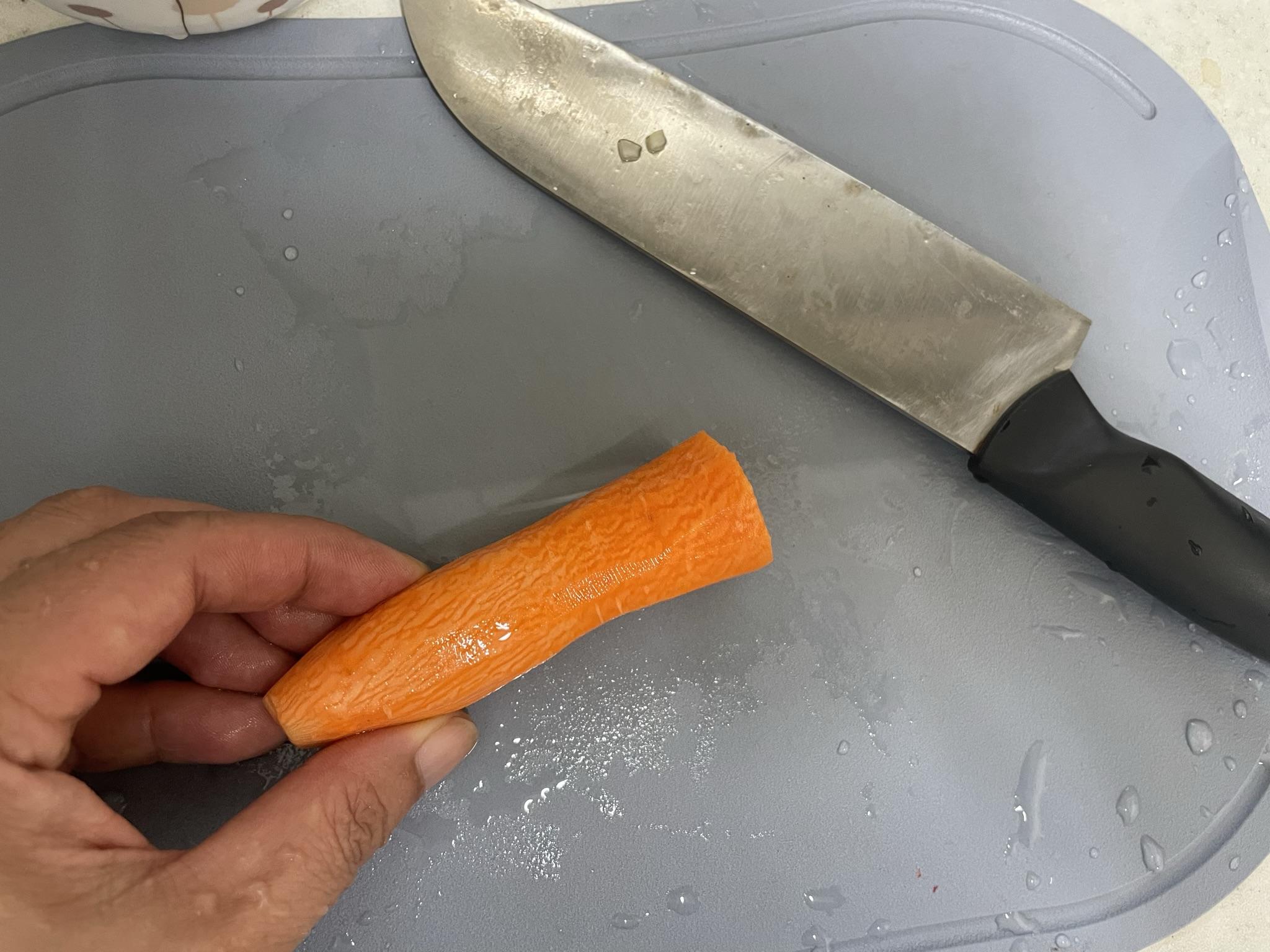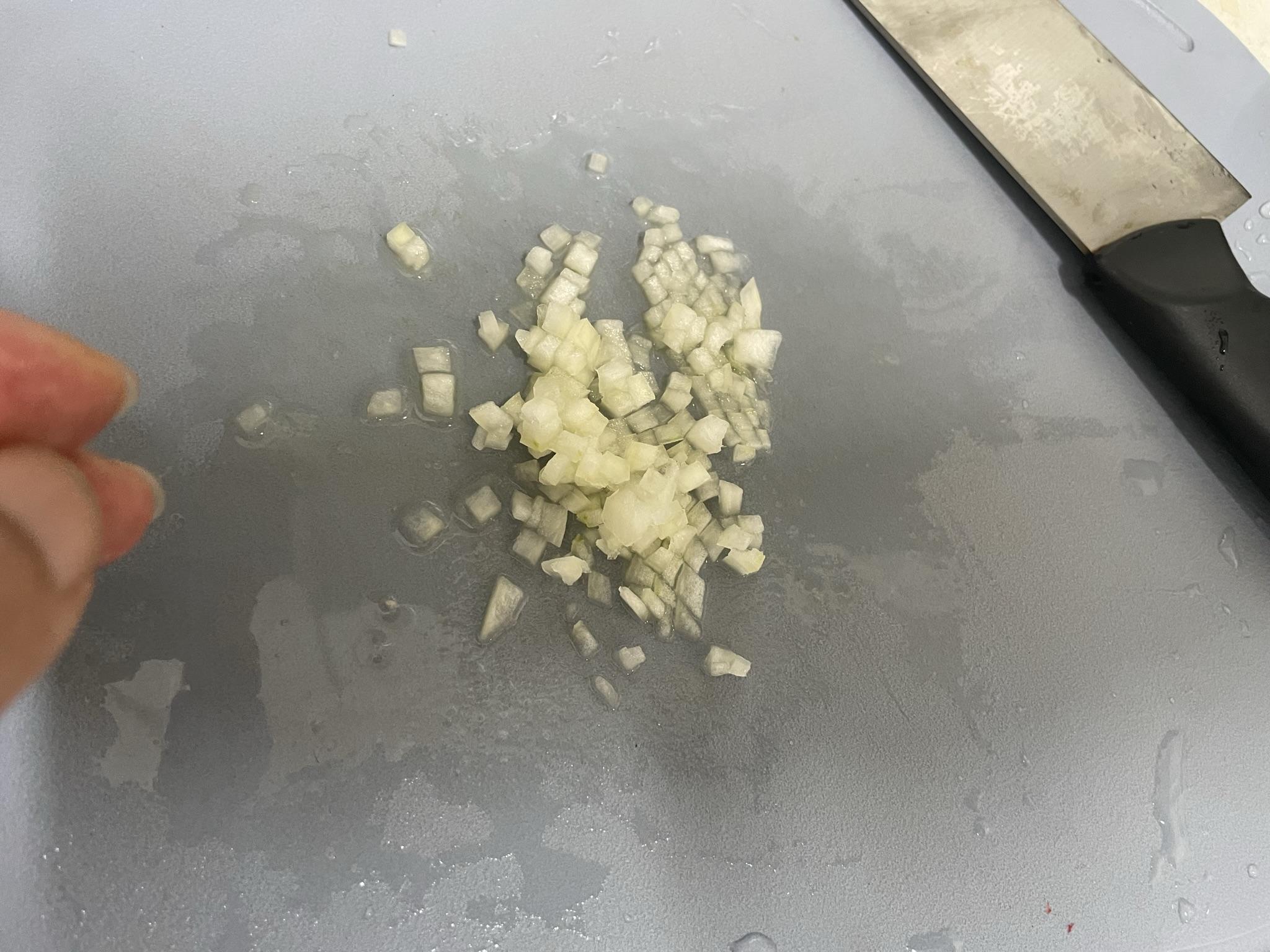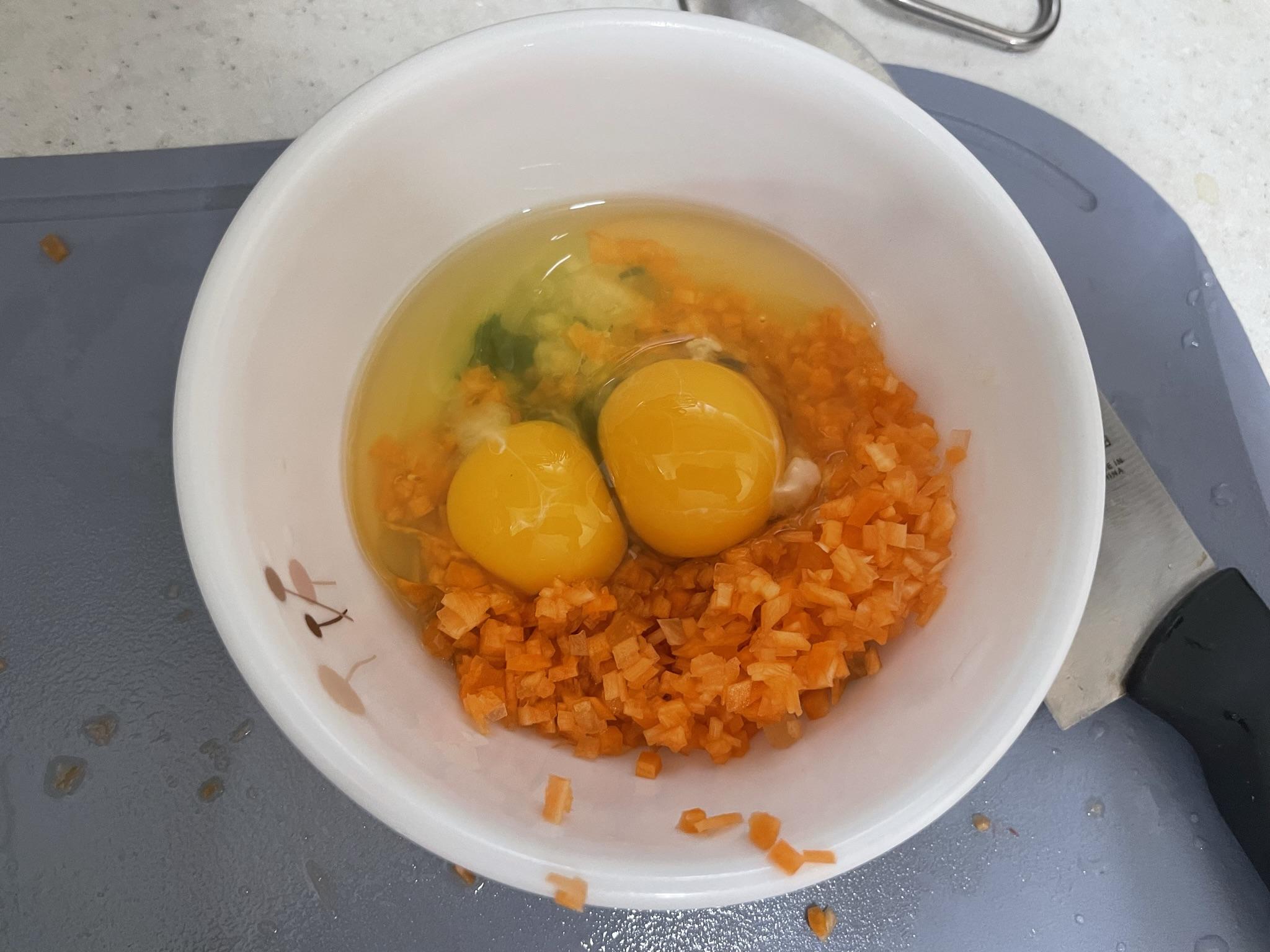3. 하트 안에 채워 넣을 계란물을 만듭니다. , 양파, 당근을 칼로 다져 준비합니다.