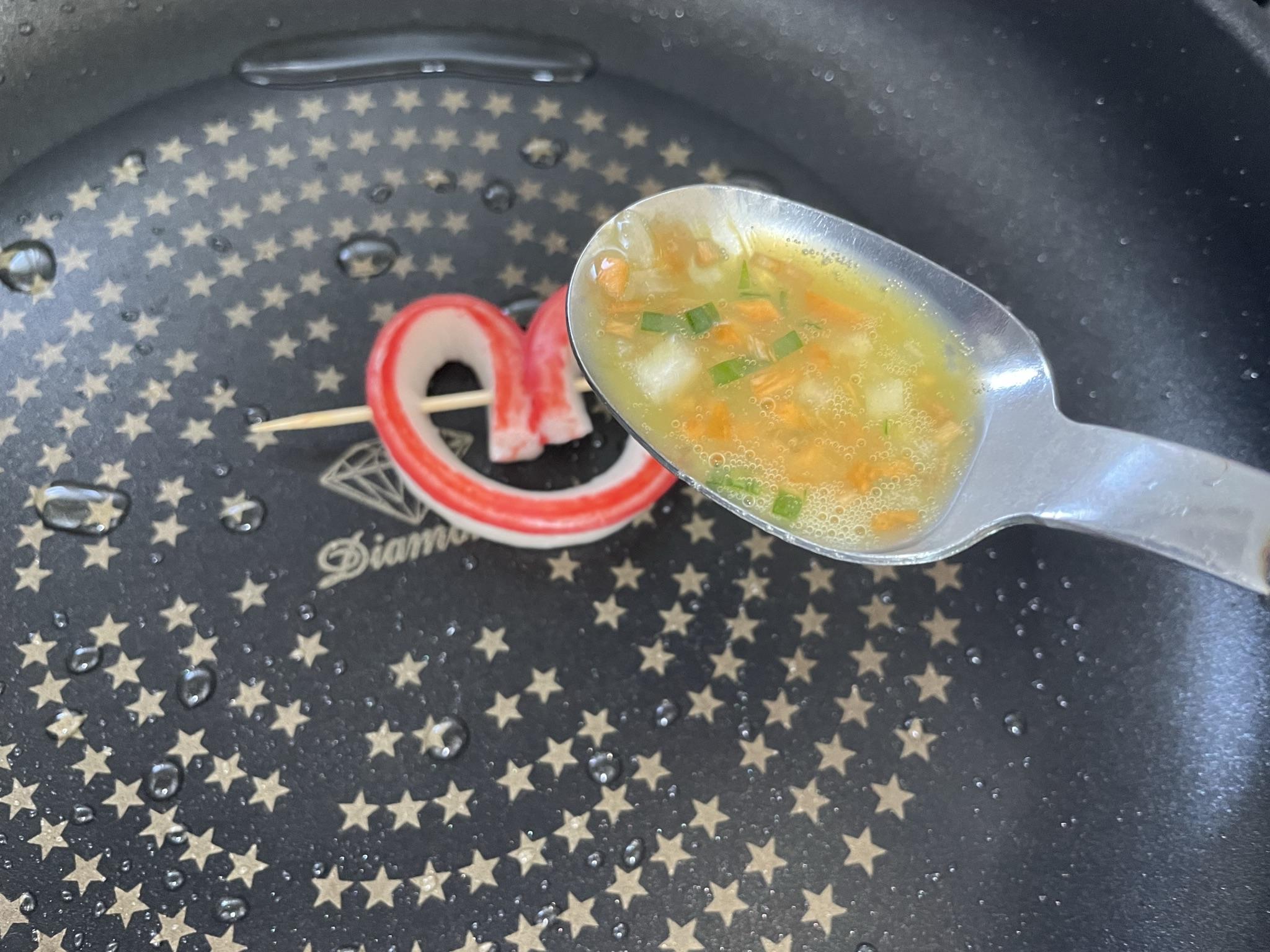 6. 만들어 둔 하트모양 맛살을 팬에 올려놓습니다.