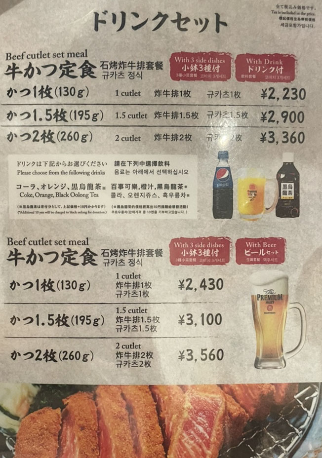 하지만 1cutlet(130g), 1.5cutlet(195g), 2cutlet(260g)으로 고기 양을 선택해야 하고, 음료 세트 또는 맥주 세트를 선택하면 됩니다.