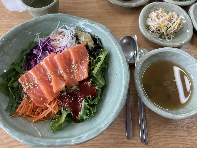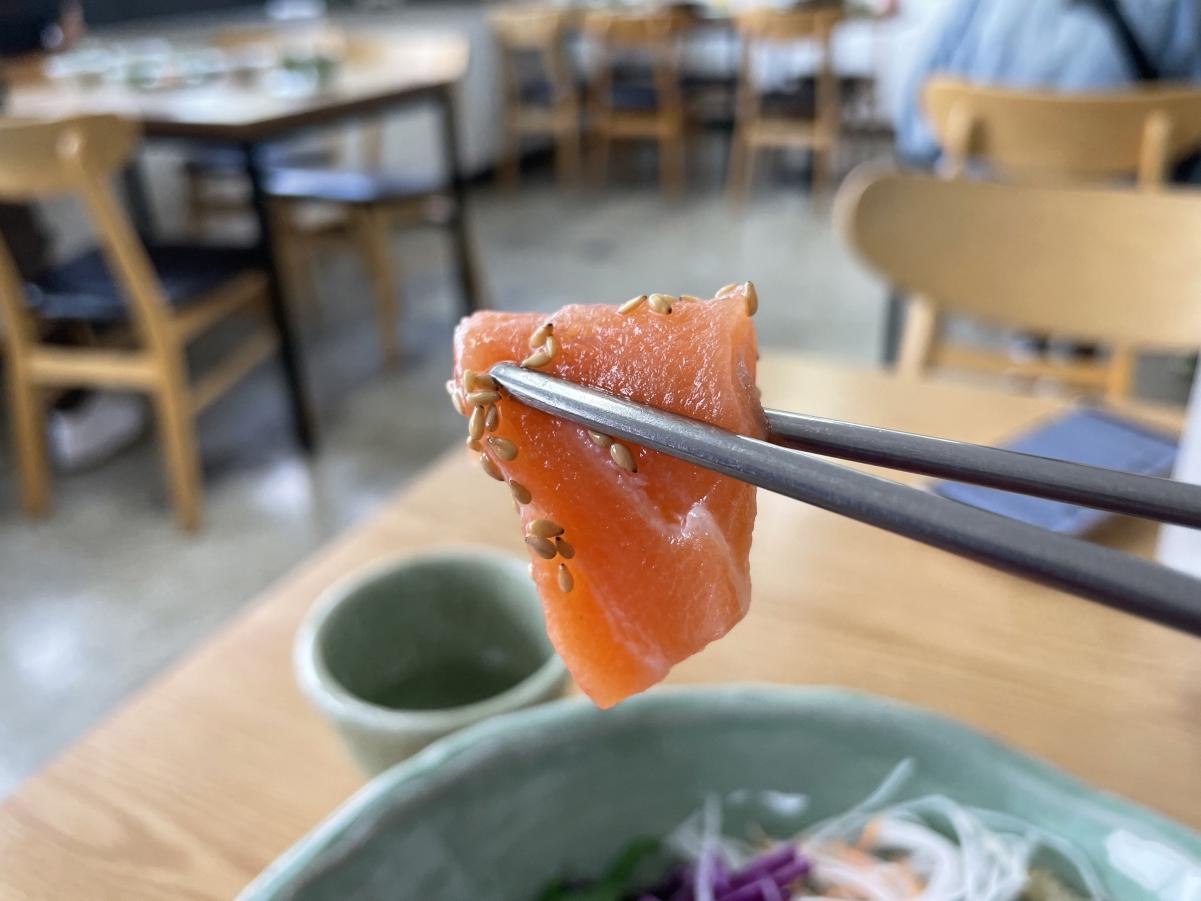 연어회비빔밥은 연어가 신선하고 부드럽네요.