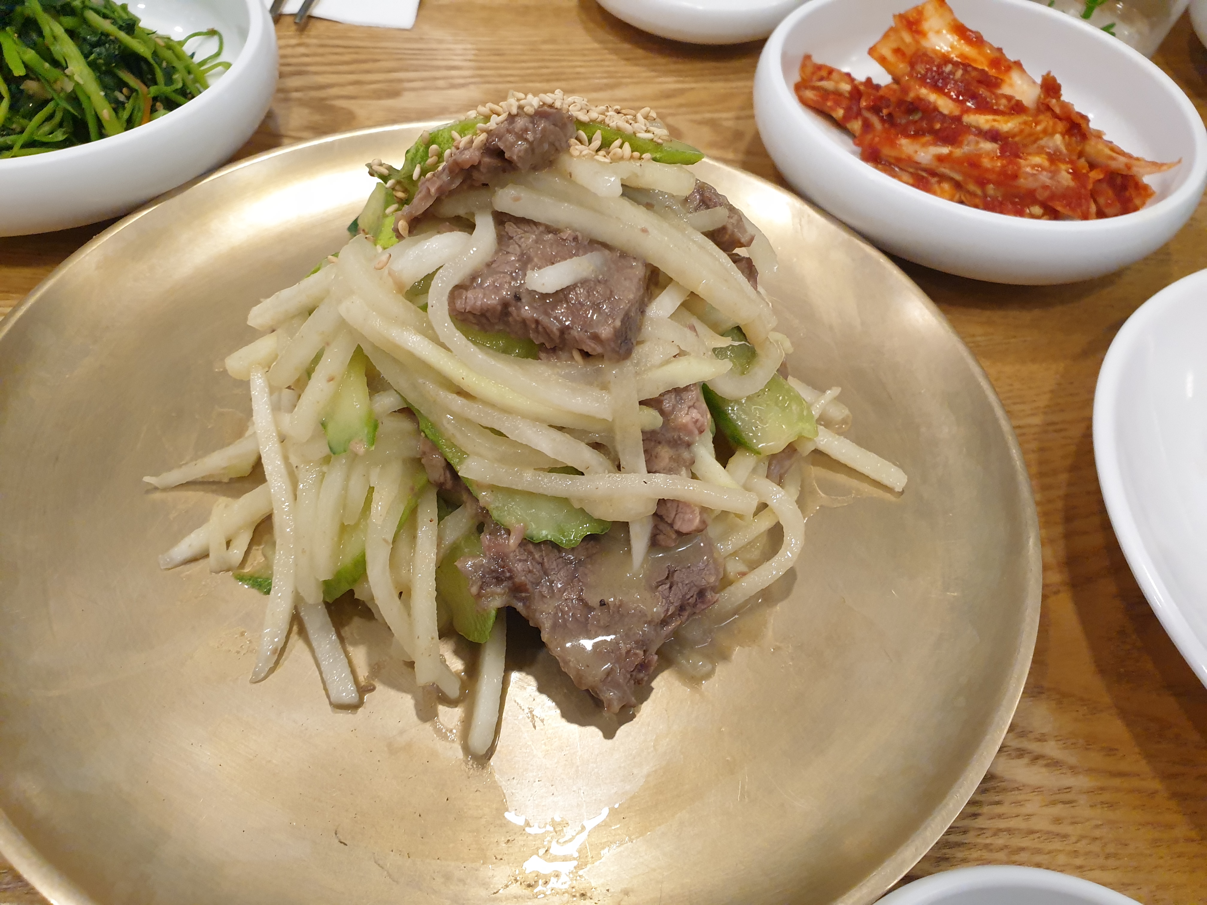 한우 수육을 야채와 함께 차게 무친 요리인데 겨자소스로 무쳐서 겨자 향이 수육과 잘 어울리네요.