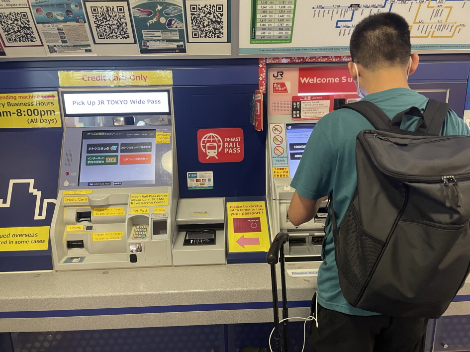교통카드 발급기 앞에 외국인들이 길게 줄을 서 있네요. 발급기 중에 한 대만 웰컴 스이카 카드를 만들 수 있는데요. 이곳 빨간색 기계 Welcome Suica라고 써 있는 발급기에서 만들면 됩니다.