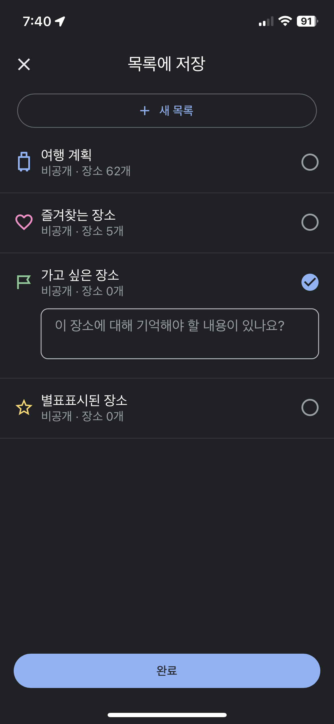 여행 계획, 즐겨찾는 장소, 가고 싶은 장소, 별표표시된 장소 중 적당한 곳에 체크합니다.