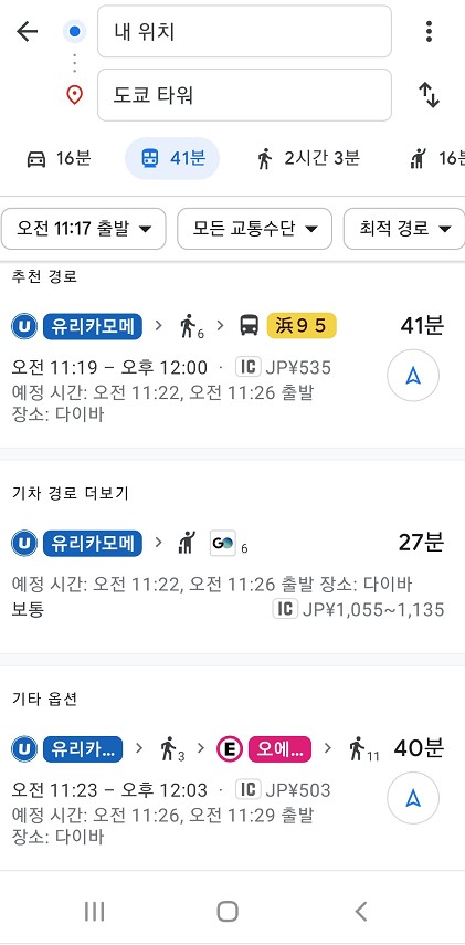 2. 이렇게 현재위치에서 목적지까지 갈 수 있는 여러 가지 방법이 검색됩니다.