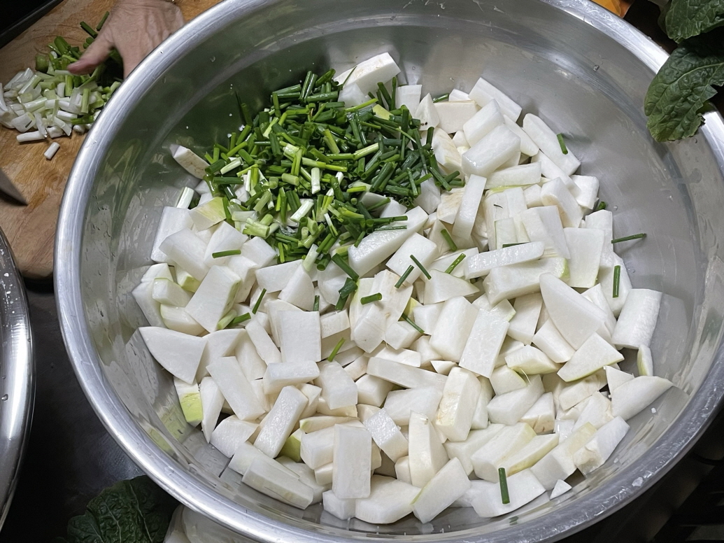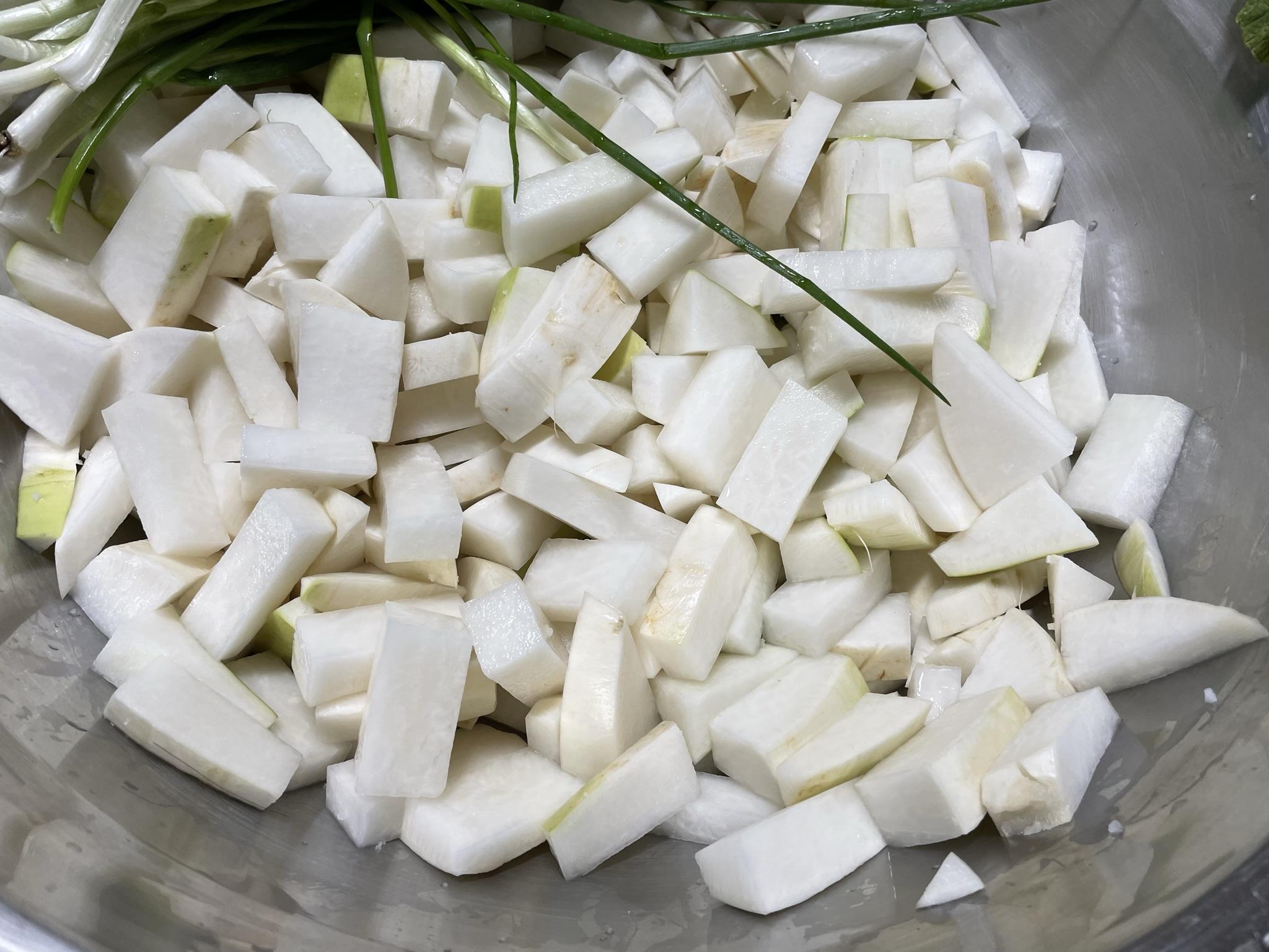 3. 쪽파를 약 3cm 정도 길이로 잘라 절인무에 넣어요.