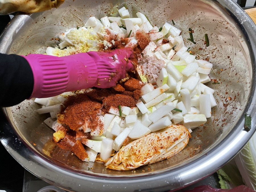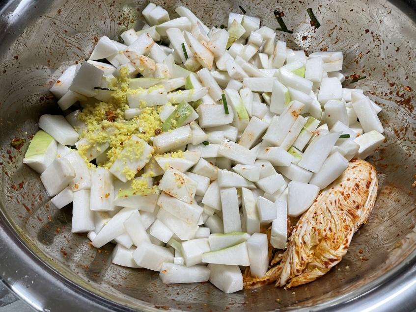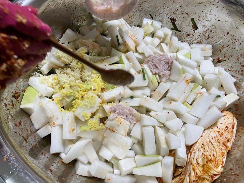 4. 다진마늘, 다진생강, 참치액, 새우젓, 고춧가루, 까나리액젓, 설탕을 넣고 버무립니다.