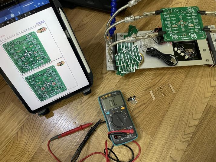 저항과 콘덴서, 트랜지스터 등의 부품들을 제자리에 끼우고 납땜을 합니다.